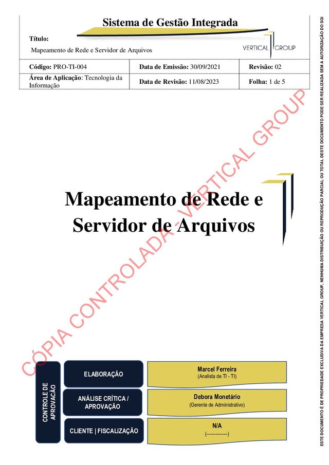 de Arquivos Código: PRO-TI-004 Data de Emissão: 30/09/2021 Revisão: 02 Área de Aplicação: Tecnologia da Informação Data de Revisão: 11/08/2023 Folha: 3 de 5 ESTE DOCUMENTO É DE PROPRIEDADE EXCLUSIVA DA EMPRESA VERTICAL GROUP, NENHUMA DISTRIBUIÇÃO OU REPRODUÇÃO PARCIAL OU TOTAL DESTE DOCUMENTO PODE SER REALIZADA SEM A AUTORIZAÇÃO DO SGI Garantir a integridade de todos os arquivos e documentos da empresa e proteção ao acesso dos arquivos da rede. Gestores: Solicitar ao TI as permissões de acesso as pastas que devem ser visíveis de acordo com o perfil do usuário. Nota: As demais responsabilidades e autoridades estão definidas no procedimento específico 5 - TERMOS E DEFINIÇÕES Backup: cópia de segurança de documentos em meio eletrônico (nuvem). Rede: conjunto de computadores, impressoras e periféricos interligados, compartilhando o mesmo ambiente lógico. Permissão: Um termo genérico para a autorização legal. Acesso: É a forma abreviada como no mundo dos sistemas de informação e documentação cientifica se refere permissão ao documento. TI: Tecnologia da Informação. Pasta: Local onde são inseridos os arquivos. 6 - DETALHAMENTO O mapeamento de rede consiste em facilitar o acesso de arquivos/pastas, a usuários de computadores que estejam conectados em uma rede. Um servidor na nuvem, ou um cloud server, é um grupo de maquinário trabalhando juntos, como uma só. Em vez de ter um equipamento disponível na sua empresa, você contrata as máquinas na “nuvem” com as configurações necessárias para atender as especificidades da organização. Hospedar os dados na nuvem quer dizer colocar as suas referências em um data center gerenciado por uma empresa especializada no assunto. Essa prática também é conhecida por cloud computing. Caso ocorra algum problema com uma das máquinas na nuvem, outra máquina assumirá a carga, impedindo que seu sistema ou sites fiquem fora do ar. C Ó PIA C O N TR O LAD A - VER TIC AL G R O U P