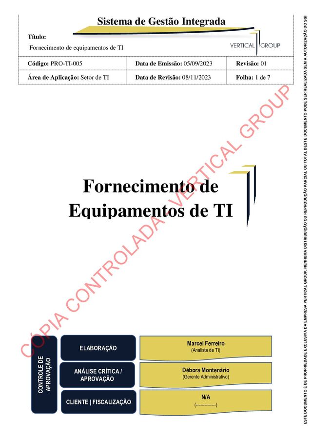 Código: PRO-TI-005 Data de Emissão: 05/09/2023 Revisão: 01 Área de Aplicação: Setor de TI Data de Revisão: 08/11/2023 Folha: 3 de 7 ESTE DOCUMENTO É DE PROPRIEDADE EXCLUSIVA DA EMPRESA VERTICAL GROUP, NENHUMA DISTRIBUIÇÃO OU REPRODUÇÃO PARCIAL OU TOTAL DESTE DOCUMENTO PODE SER REALIZADA SEM A AUTORIZAÇÃO DO SGI 4.2 - SETOR REQUISITANTE O Setor requisitante possui as seguintes responsabilidades: • Solicitar os equipamentos para atendimento ao projeto através de requisição Bimer e chamado Karoo. 4.3 - GERÊNCIA A Gerência possui as seguintes responsabilidades: • Analisar aprovação da requisição através do Bimer. 4.4 - SETOR DE TECNOLOGIA DA INFORMAÇÃO O setor de TI possui as seguintes responsabilidades: • Fornecer os equipamentos solicitados pela coordenação, após aprovação gerencial, e entregar ao almoxarifado, juntamente com o termo de responsabilidade. • Enviar através de e-mail a descrição completa dos equipamentos fornecidos para o setor requisitante e para o almoxarifado para critério de conferência. 4.5 - SETOR DE SUPRIMENTOS O setor de Suprimentos possui as seguintes responsabilidades: • Garantir a emissão do Romaneio no envio de notebook para bordo e manter o controle dos equipamentos disponibilizados em conjunto com o TI • Realizar a logística de envio e de devolução dos equipamentos disponibilizados pelo TI para atendimento aos projetos do Operacional 5 - TERMOS E DEFINIÇÕES Equipamentos de TI: Entende-se como, equipamentos de TI, todos os ativos eletrônicos fornecidos pelo departamento de TI ou que fazem parte da estrutura de TI (Notebook, desktop, câmera, celular, mouse, teclado, impressoras, monitores, roteadores, etc.). Karoo: Sistema de Gestão de Chamados utilizados pelo TI e para solicitações dos colabores (suporte técnico, dúvidas e requisições). Bimer: Sistema Alterdata utilizado pelos colaboradores para fazer requisições ao TI, ao almoxarifado e/ou departamento de compras. Setor requisitante: Entende-se como setor requisitante todos os subsetores da equipe operacional (Reparo, MPW, Pintura, Inspeção). C Ó PIA C O N TR O LAD A - VER TIC AL G R O U P