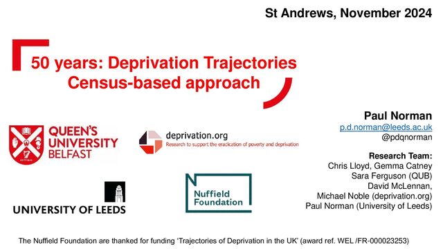 (2005) How accurate are Townsend Deprivation Scores as predictors of self-reported health? A comparison with individual level data, Journal of Public Health, 27(1): 101–106, https://doi.org/10.1093/pubmed/fdh193 Allik, M., Leyland, A., Ichihara, M. Y. T., & Dundas, R. (2020). Creating small-area deprivation indices: a guide for stages and options. J Epidemiol Community Health, 74(1), 20-25. Christie S, Fone D (2003) Does car ownership reflect socio-economic disadvantage in rural areas? A cross-sectional geographical study in Wales, UK. Public Health: 117, 2, 112. Exeter DJ, Feng Z, Zhao J, Cavadino A & Norman P (2019) The geographic harmonisation of Scotland’s small area census data, 1981 to 2011. Health & Place: 57 22-26: https://doi.org/10.1016/j.healthplace.2019.02.003 Haynes, R., Gale, S., Lovett, A. & Bentham, G. (1996). Unemployment rate as an updatable health needs indicator for small areas. Journal of Public Health Medicine 18(1): 27-32. Higgs, G., Senior, M. L. & Williams, H. C. W. L. (1998). Spatial and temporal variation of mortality and deprivation 1: widening health inequalities. Environment & Planning A 30(9) 1661-1682. Lloyd CD, Norman PD & McLennan D (2023) Deprivation in England, 1971–2020. Applied Spatial Analysis & Policy https://doi.org/10.1007/s12061-022- 09486-8 Martin, D., Brigham, P., Roderick, P., Barnett, S., & Diamond, I. (2000). The (mis)representation of rural deprivation. Environment & Planning A, 32(4), 735- 751. Norman P & Darlington-Pollock F (2017) The Changing Geography of Deprivation in Great Britain: Exploiting Small Area Census Data, 1971 to 2011. Chapter 30 in Stillwell, J (ed.) Routledge Handbook of Census Resources, Methods and Applications: 404-420 Norman P & Riva M (2012) Population health across space and time: the geographical harmonisation of the ONS Longitudinal Study for England and Wales. Population, Space & Place 18: 483-502 DOI: 10.1002/psp.1705 Norman P (2010) Identifying change over time in small area socio-economic deprivation. Applied Spatial Analysis and Policy 3(2-3) 107-138 Norman P (2016) The Changing Geography of Deprivation in Britain: 1971 to 2011 and Beyond. Chapter 11 in Champion T and Falkingham J (eds.) Population change in the United Kingdom: Rowman & Littlefield: London: 193-214 Norman P, Marshall A & Lomax N (2017) Data analytics: on the cusp of using new sources? Radical Statistics 116: 19-30 http://www.radstats.org.uk/no116/ Norman P, Lloyd C, McLennan D, Ferguson S & Catney G (2024) 50-year Deprivation Trajectories: Local Area Change in England and Wales, 1971– 2021. Applied Spatial Analysis & Policy https://doi.org/10.1007/s12061-024-09583-w ONS (2023) Housing, England and Wales: Census 2021: Rooms, bedrooms, and occupancy rating Senior M L (2002) Deprivation indicators. In The Census Data System edited by Rees P, Martin D & Williamson P. John Wiley: Chichester; 123-137. Townsend P, Phillimore P & Beattie A (1988) Health and deprivation: inequality and the North Routledge: London and New York