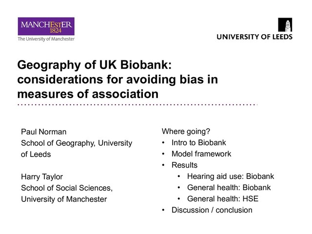 patients living within 10 mile radius of one of 23 recruitment centres • Sample: 502,671 people aged 40-69 collected 2006-2010 • Questionnaire: Self-report completion • Testing: Physical measurements, provision of blood, urine and saliva samples • Benefits: Very large sample, comprehensive set of measurements • Issues: – Sample not representative: older, more white, female and affluent (Fry et al. 2017) – Geographically-clustered (urban bias) – Some measures only collected part-way through and some not available for certain collection centres