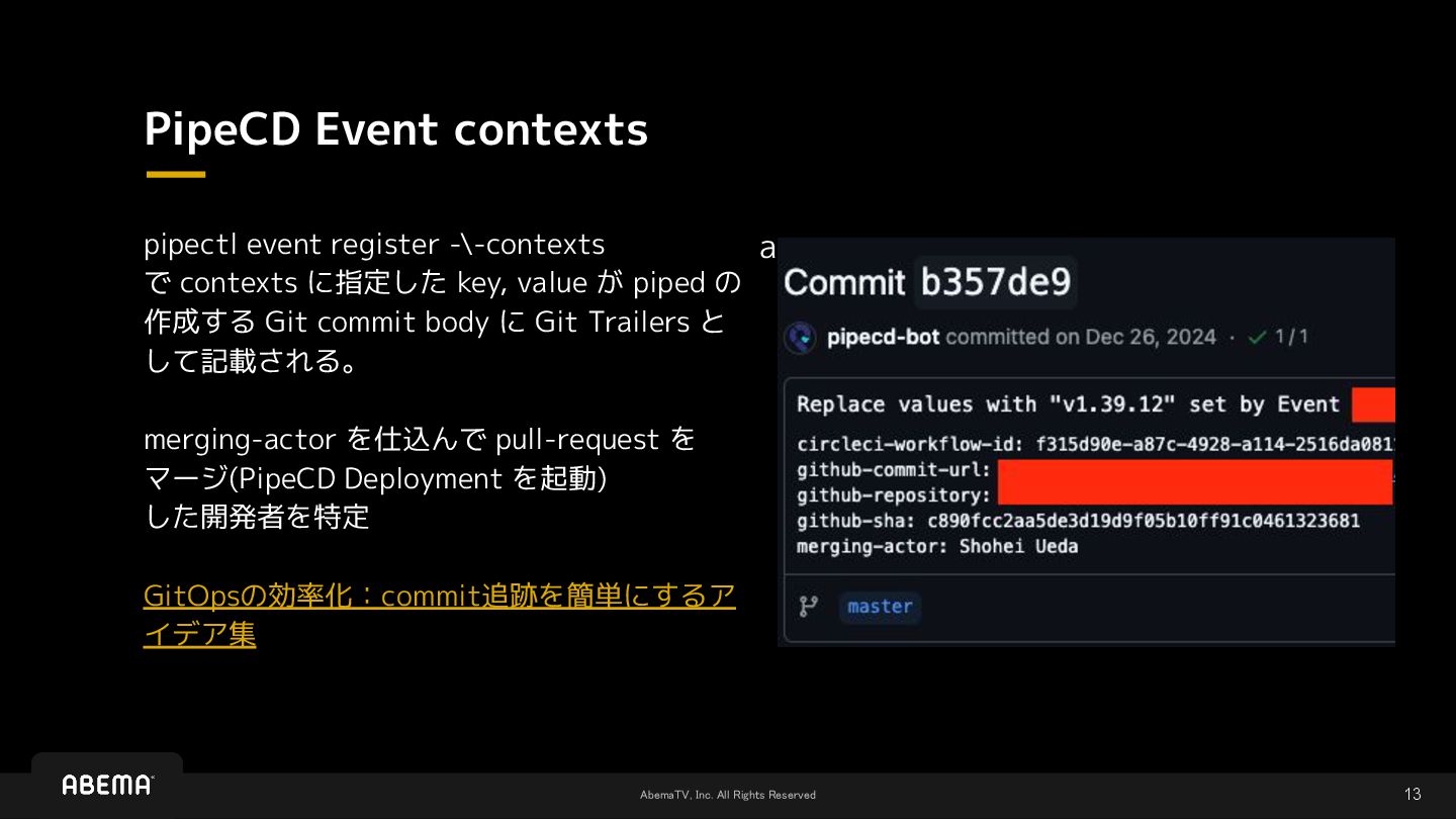 で contexts に指定した key, value が piped の 作成する Git commit body に Git Trailers と して記載される。 merging-actor を仕込んで pull-request を マージ(PipeCD Deployment を起動) した開発者を特定 GitOpsの効率化:commit追跡を簡単にするア イデア集 PipeCD Event contexts a
