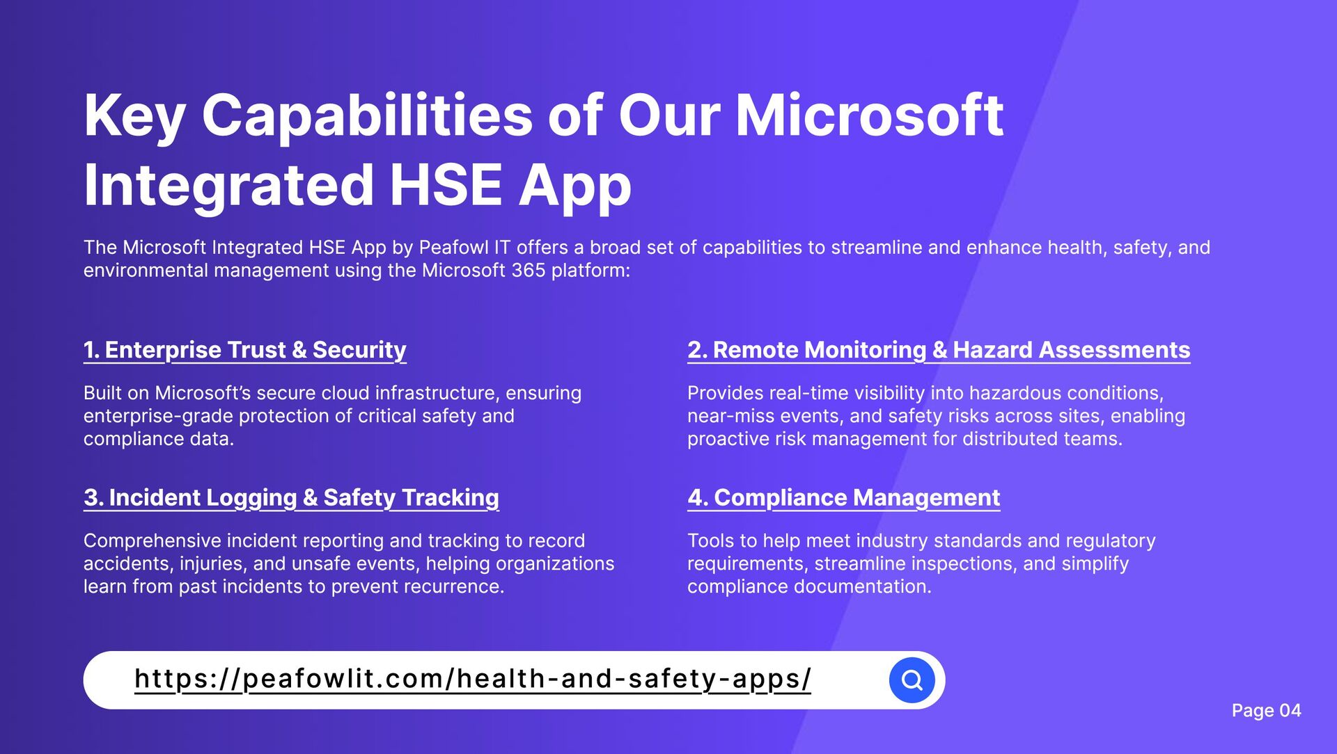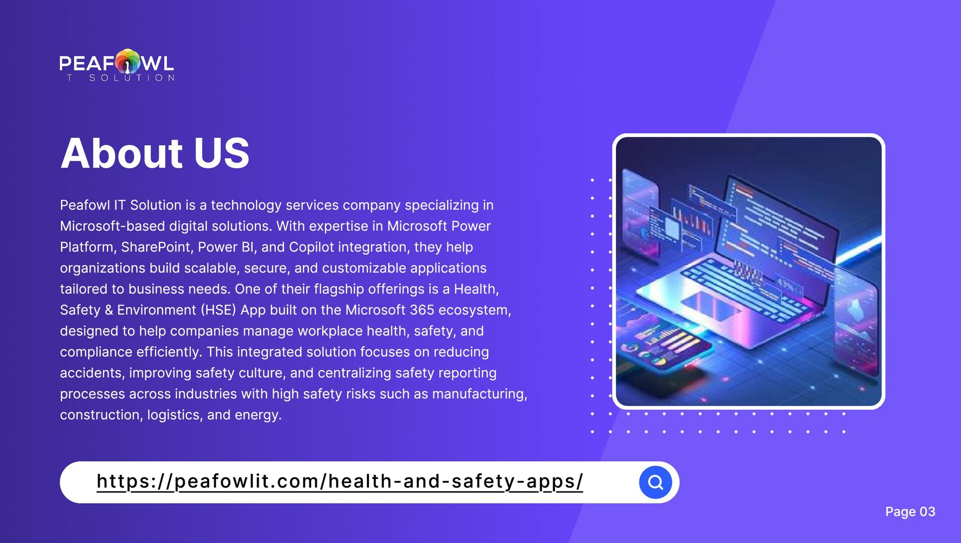 o w l I T S o l u t i o n i s a t e c h n o l o g y s e r v i c e s c o m p a n y s p e c i a l i z i n g i n M i c r o s o f t - b a s e d d i g i t a l s o l u t i o n s . W i t h e x p e r t i s e i n M i c r o s o f t P o w e r P l a t f o r m , S h a r e P o i n t , P o w e r B I , a n d C o p i l o t i n t e g r a t i o n , t h e y h e l p o r g a n i z a t i o n s b u i l d s c a l a b l e , s e c u r e , a n d c u s t o m i z a b l e a p p l i c a t i o n s t a i l o r e d t o b u s i n e s s n e e d s . O n e o f t h e i r f l a g s h i p o f f e r i n g s i s a H e a l t h , S a f e t y & E n v i r o n m e n t ( H S E ) A p p b u i l t o n t h e M i c r o s o f t 3 6 5 e c o s y s t e m , d e s i g n e d t o h e l p c o m p a n i e s m a n a g e w o r k p l a c e h e a l t h , s a f e t y , a n d c o m p l i a n c e e f f i c i e n t l y . T h i s i n t e g r a t e d s o l u t i o n f o c u s e s o n r e d u c i n g a c c i d e n t s , i m p r o v i n g s a f e t y c u l t u r e , a n d c e n t r a l i z i n g s a f e t y r e p o r t i n g p r o c e s s e s a c r o s s i n d u s t r i e s w i t h h i g h s a f e t y r i s k s s u c h a s m a n u f a c t u r i n g , c o n s t r u c t i o n , l o g i s t i c s , a n d e n e r g y . h t t p s : / / p e a fow l i t . c o m / h e a l t h - a n d - s a fe t y - a p p s