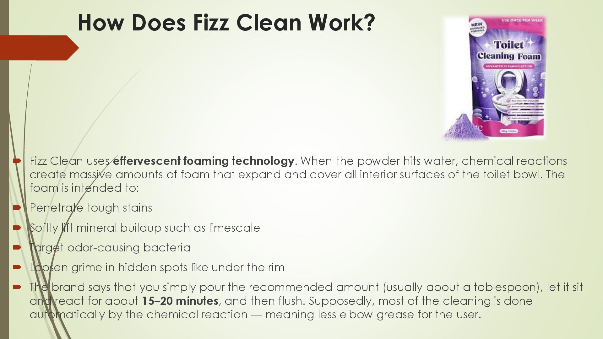 Fizz Clean is a toilet bowl cleaning product formulated as a powder that produces a foaming reaction when it contacts water. It’s designed to remove stains, limescale, rust, grime, and bacteria from toilet bowls without the need for scrubbing.