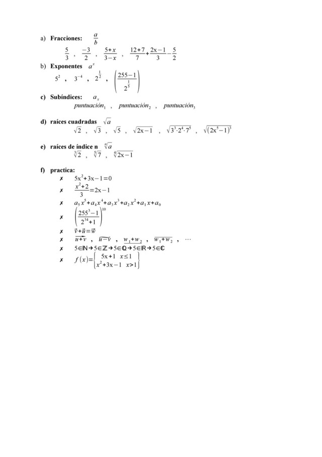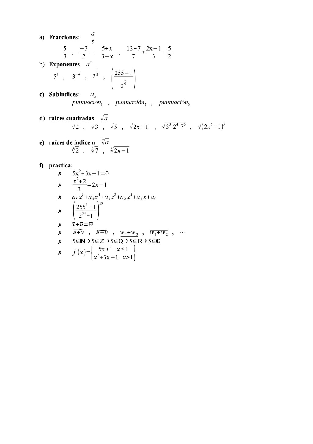 5+ x 3−x , 12+7 7 + 2x−1 3 − 5 2 b) Exponentes ax 52 , 3−4 , 2 1 2 , (255−1 2 1 5 ) c) Subíndices: a x puntuación 1 , puntuación 2 , puntuación 3 d) raíces cuadradas √a √2 , √3 , √5 , √2x−1 , √33⋅24⋅75 , √(2x5−1)3 e) raíces de índice n n √a 3 √2 , 5 √7 , 4 √2x−1 f) practica: ✗ 5x2+3x−1=0 ✗ x2+2 3 =2x−1 ✗ a 5 x5+a 4 x4+a 3 x3+a 2 x2+a 1 x+a 0 ✗ (2553−1 234+1 )10 ✗ ⃗ v+⃗ u=⃗ w ✗ ⃗ u+v , ̃ u−v , w 1 +w 2 , w 1 +w 2 , ⋯ ✗ 5∈ℕ→5∈ℤ→5∈ℚ→5∈ℝ→5∈ℂ ✗ f (x)= { 5x+1 x≤1 x2+3x−1 x>1 }