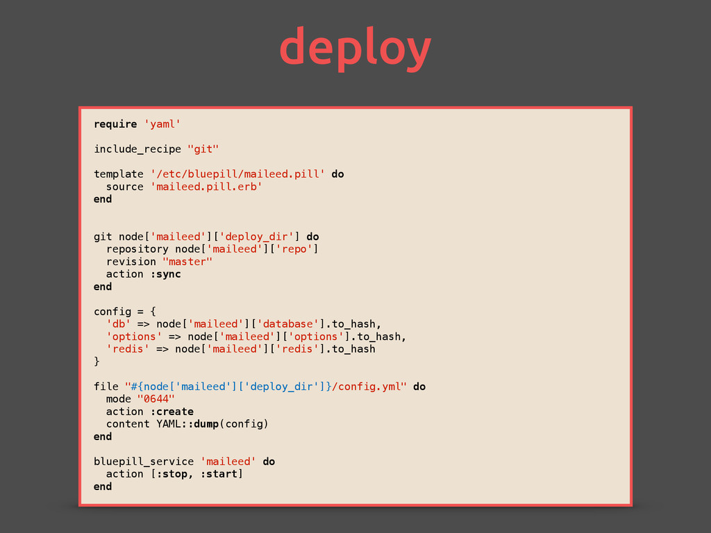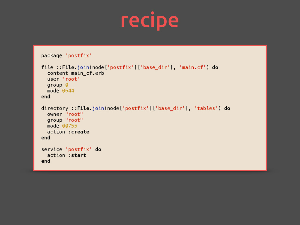 user 'root' group 0 mode 0644 end ! directory ::File.join(node['postfix']['base_dir'], 'tables') do owner "root" group "root" mode 00755 action :create end ! service 'postfix' do action :start end