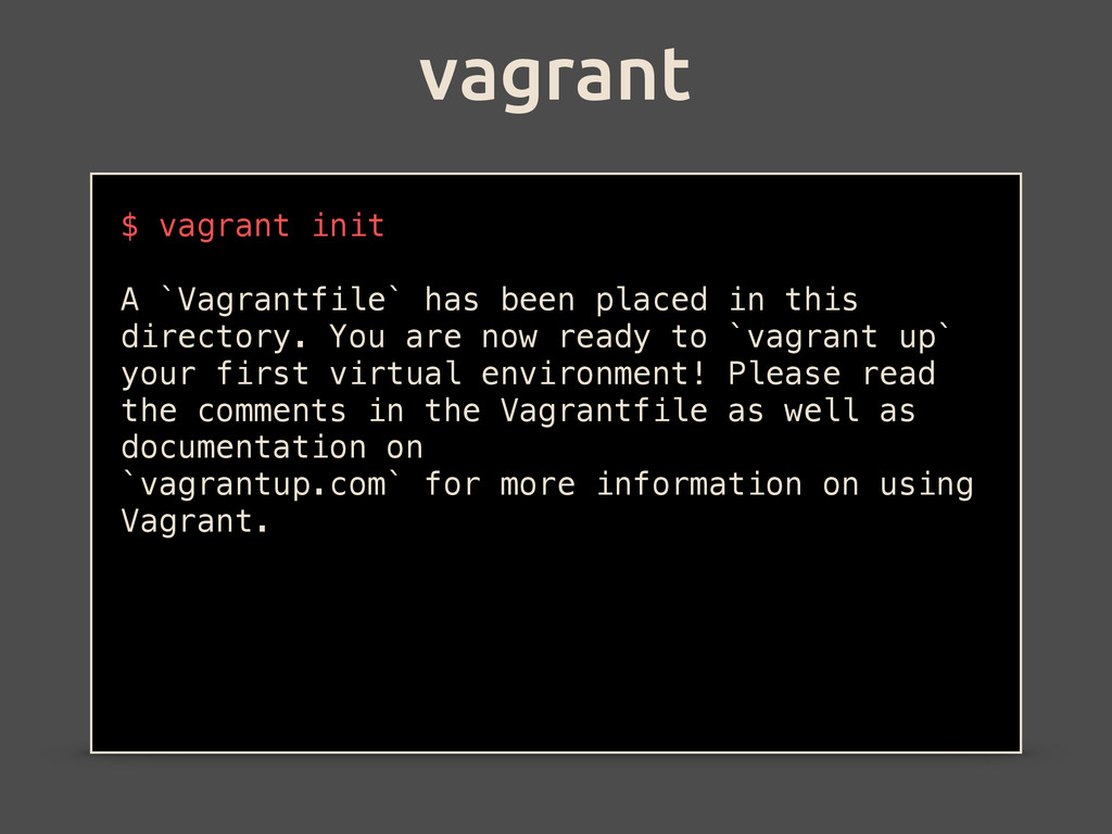in this directory. You are now ready to `vagrant up` your first virtual environment! Please read the comments in the Vagrantfile as well as documentation on `vagrantup.com` for more information on using Vagrant. !