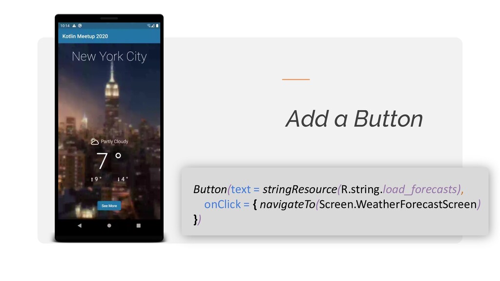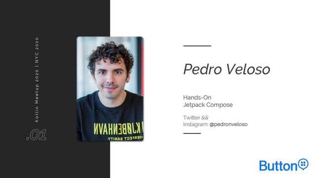 o t l i n M e e t u p 2 0 2 0 | N Y C 2 0 2 0 Pedro Veloso Twitter && Instagram: @pedronveloso Hands-On Jetpack Compose K o t l i n M e e t u p 2 0 2 0 | N Y C 2 0 2 0