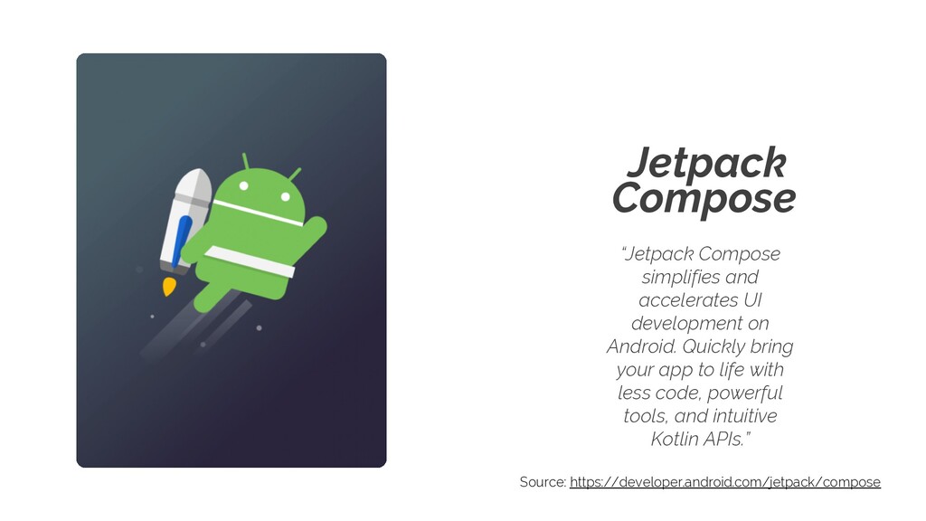 Android. Quickly bring your app to life with less code, powerful tools, and intuitive Kotlin APIs.” Source: https://developer.android.com/jetpack/compose