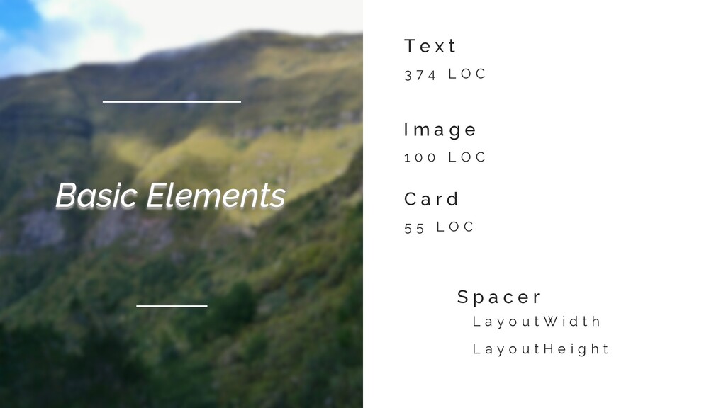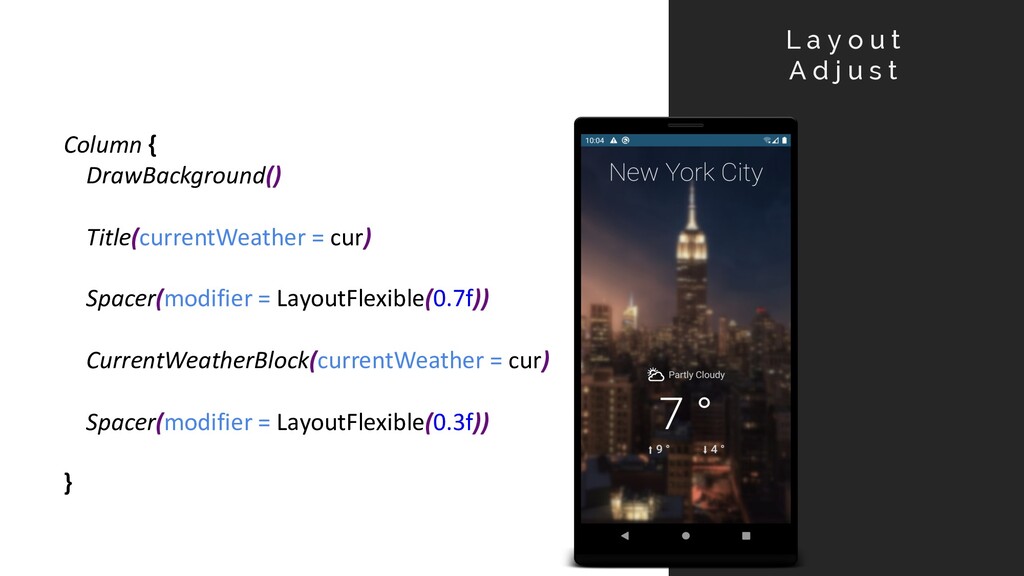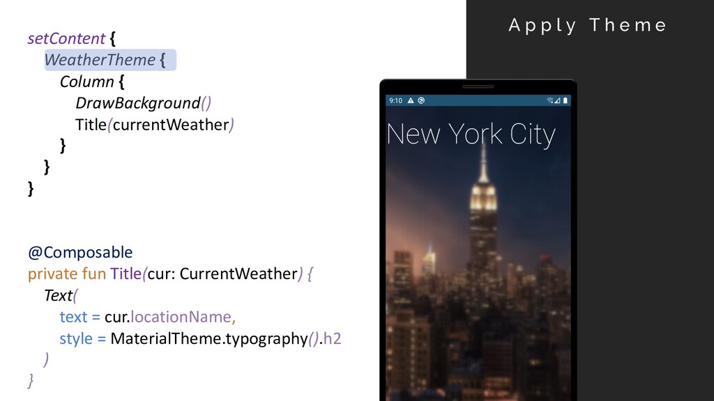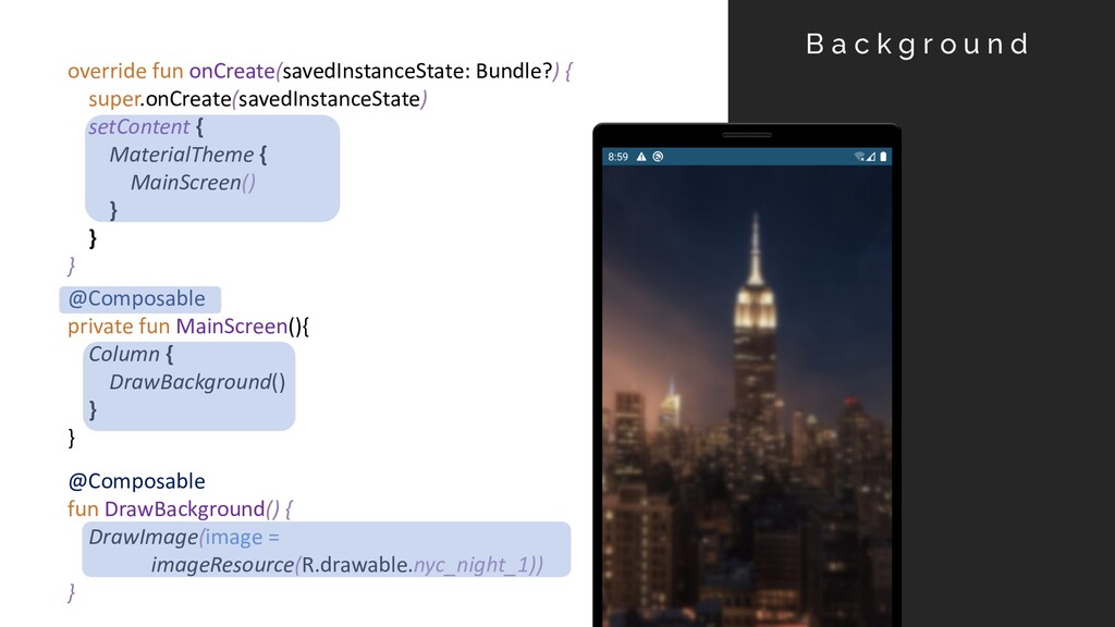 fun onCreate(savedInstanceState: Bundle?) { super.onCreate(savedInstanceState) setContent { MaterialTheme { MainScreen() } } } @Composable fun DrawBackground() { DrawImage(image = imageResource(R.drawable.nyc_night_1)) } B a c k g r o u n d