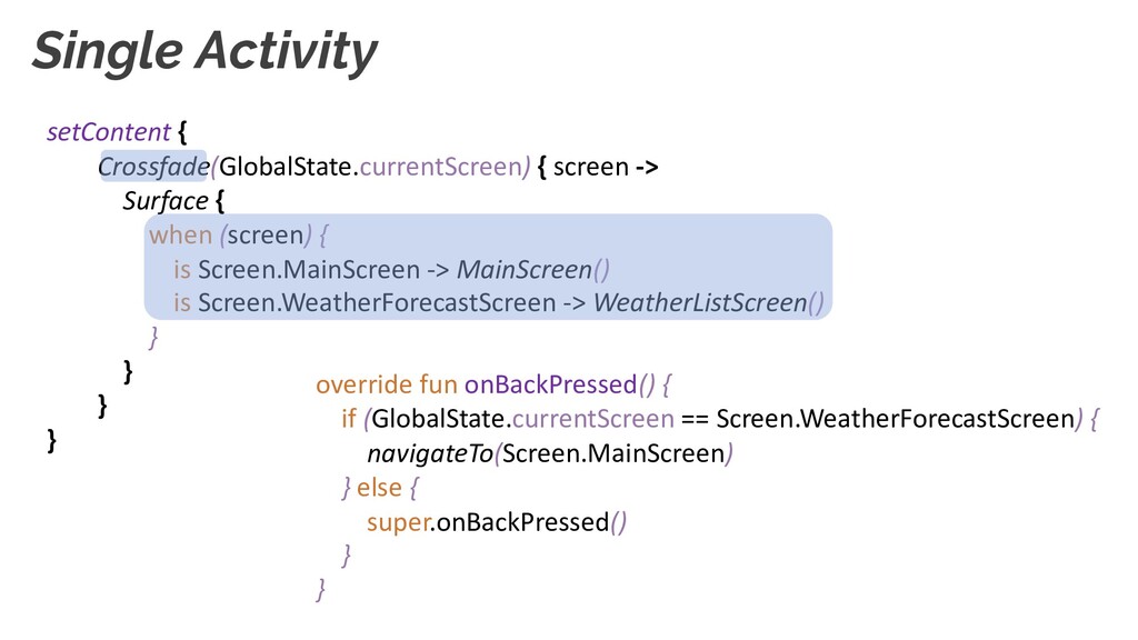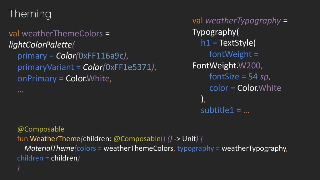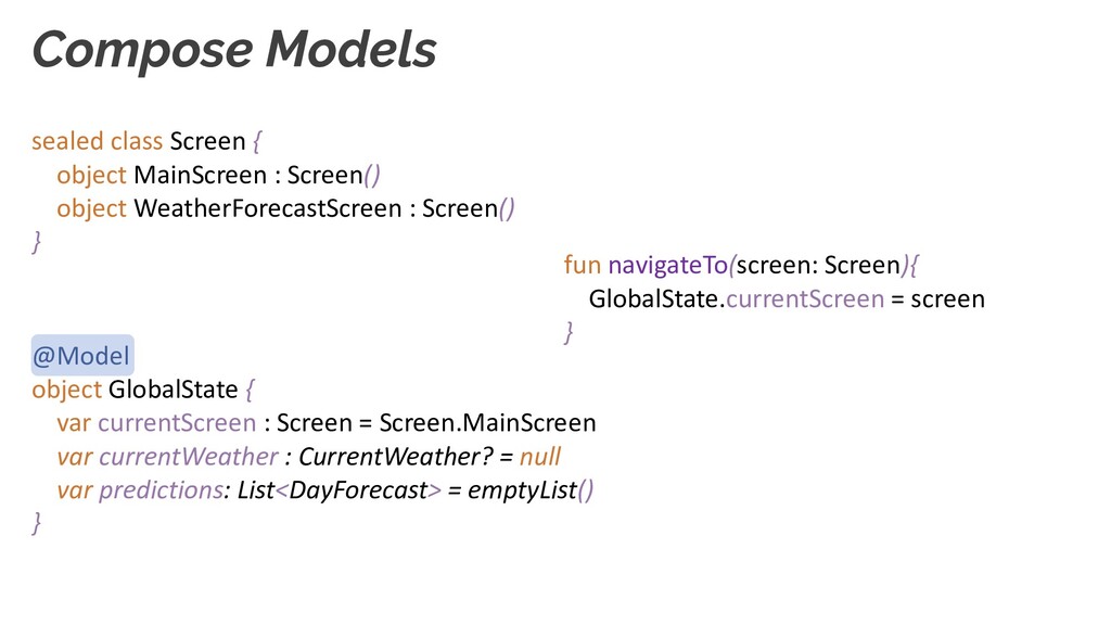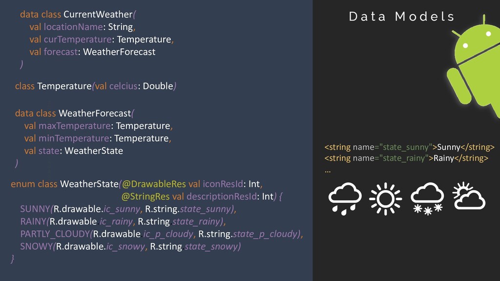 S E N T A T I O N data class CurrentWeather( val locationName: String, val curTemperature: Temperature, val forecast: WeatherForecast ) class Temperature(val celcius: Double) data class WeatherForecast( val maxTemperature: Temperature, val minTemperature: Temperature, val state: WeatherState ) enum class WeatherState(@DrawableRes val iconResId: Int, @StringRes val descriptionResId: Int) { SUNNY(R.drawable.ic_sunny, R.string.state_sunny), RAINY(R.drawable.ic_rainy, R.string.state_rainy), PARTLY_CLOUDY(R.drawable.ic_p_cloudy, R.string.state_p_cloudy), SNOWY(R.drawable.ic_snowy, R.string.state_snowy) } <string name="state_sunny">Sunny</string> <string name="state_rainy">Rainy</string> … D a t a M o d e l s
