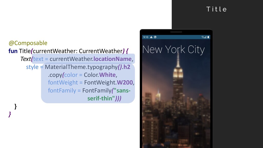 Arrangement.Center) { Spacer(LayoutHeight(16.dp)) Text(text = currentWeather.locationName, style = MaterialTheme.typography().h2) } } C e n t e r Column { DrawBackground() Title(currentWeather) }