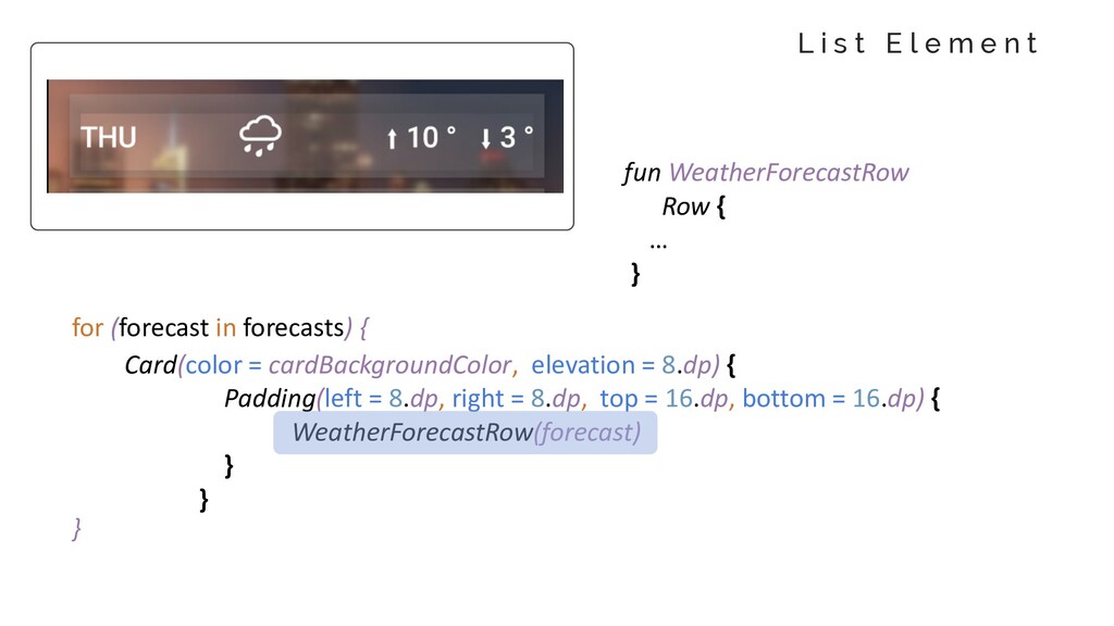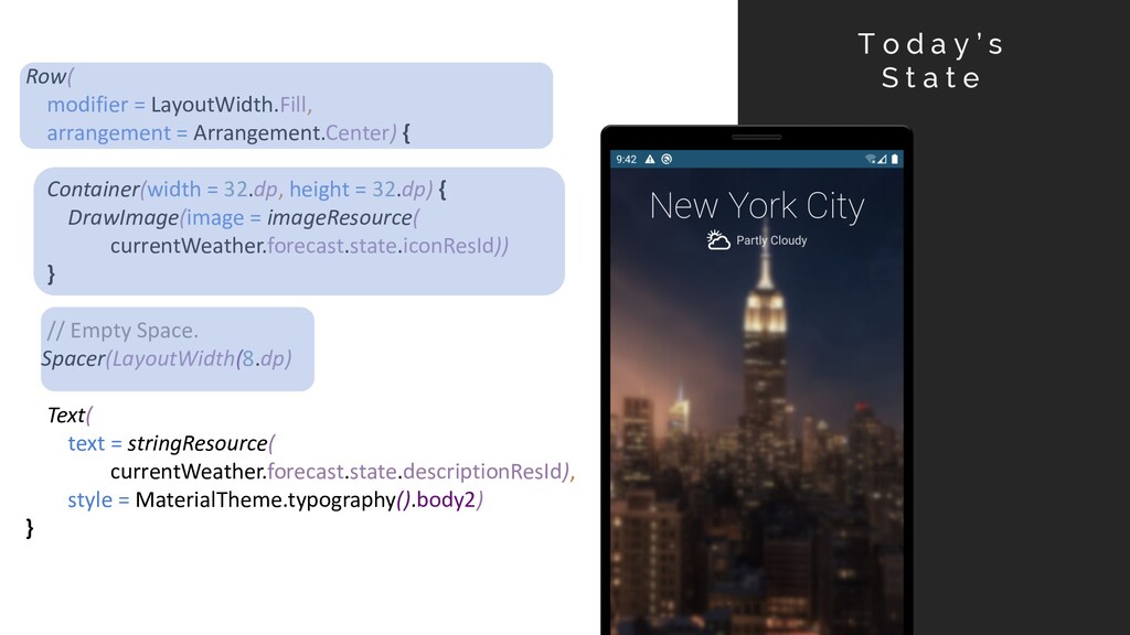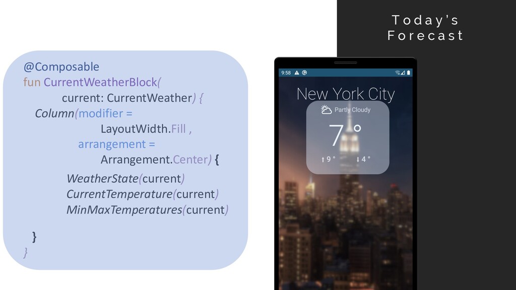 e c a s t @Composable fun CurrentWeatherBlock( current: CurrentWeather) { Column(modifier = LayoutWidth.Fill , arrangement = Arrangement.Center) { } } WeatherState(current) CurrentTemperature(current) MinMaxTemperatures(current)