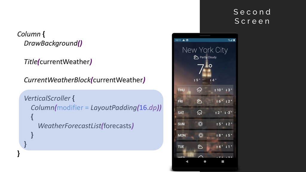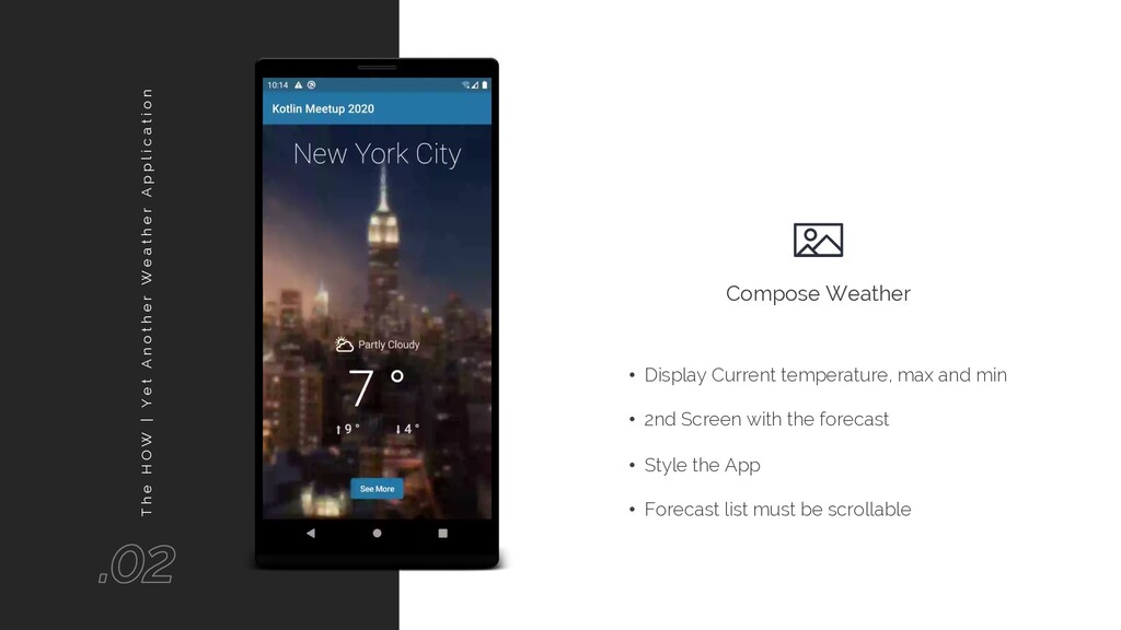 A n o t h e r W e a t h e r A p p l i c a t i o n • Display Current temperature, max and min • 2nd Screen with the forecast • Style the App • Forecast list must be scrollable Compose Weather