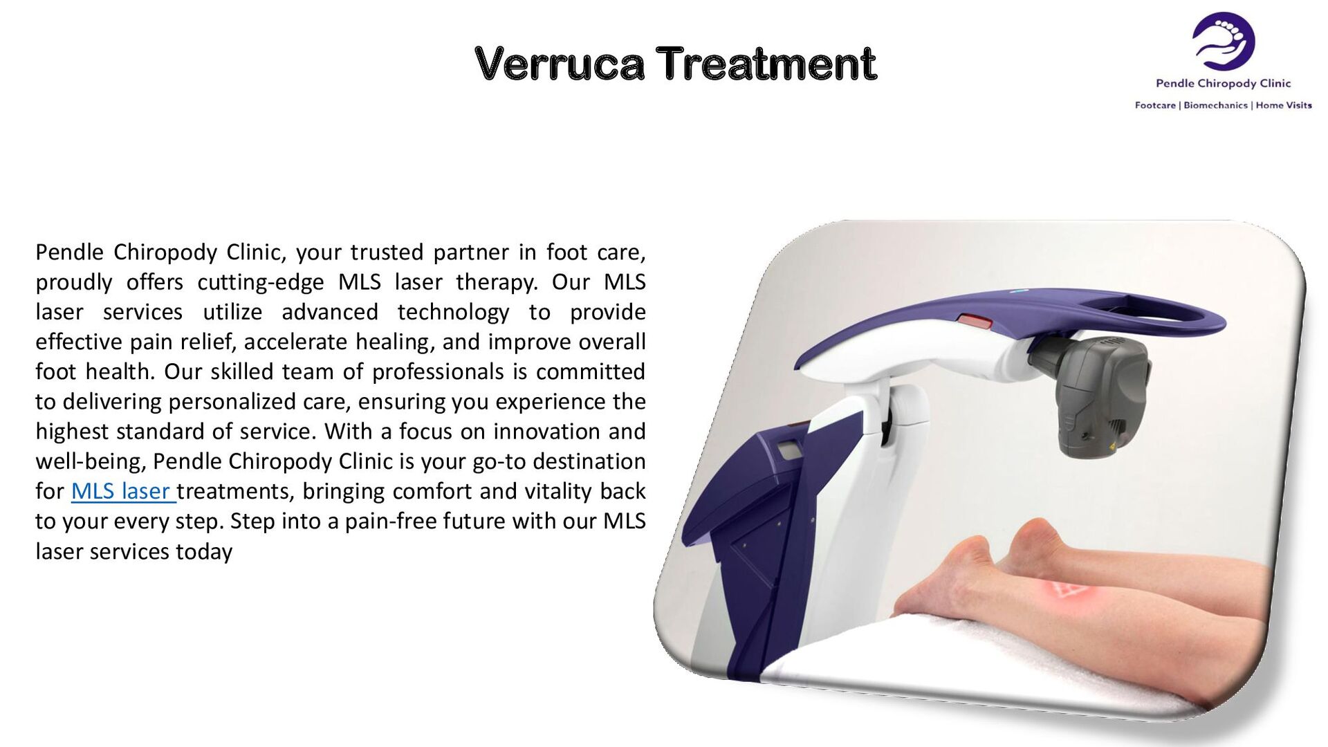 care, proudly offers cutting-edge MLS laser therapy. Our MLS laser services utilize advanced technology to provide effective pain relief, accelerate healing, and improve overall foot health. Our skilled team of professionals is committed to delivering personalized care, ensuring you experience the highest standard of service. With a focus on innovation and well-being, Pendle Chiropody Clinic is your go-to destination for MLS laser treatments, bringing comfort and vitality back to your every step. Step into a pain-free future with our MLS laser services today