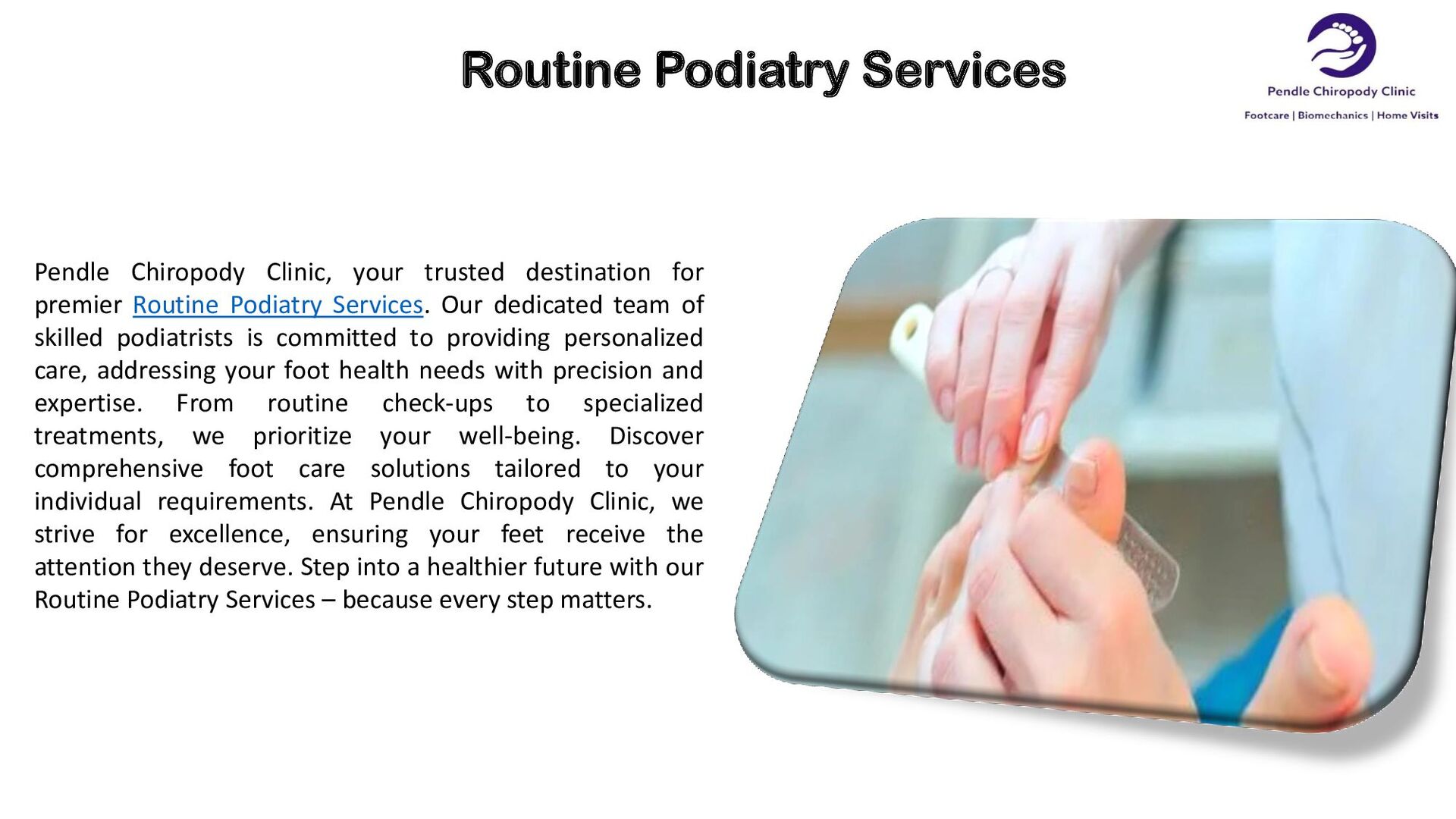 premier Routine Podiatry Services. Our dedicated team of skilled podiatrists is committed to providing personalized care, addressing your foot health needs with precision and expertise. From routine check-ups to specialized treatments, we prioritize your well-being. Discover comprehensive foot care solutions tailored to your individual requirements. At Pendle Chiropody Clinic, we strive for excellence, ensuring your feet receive the attention they deserve. Step into a healthier future with our Routine Podiatry Services – because every step matters.