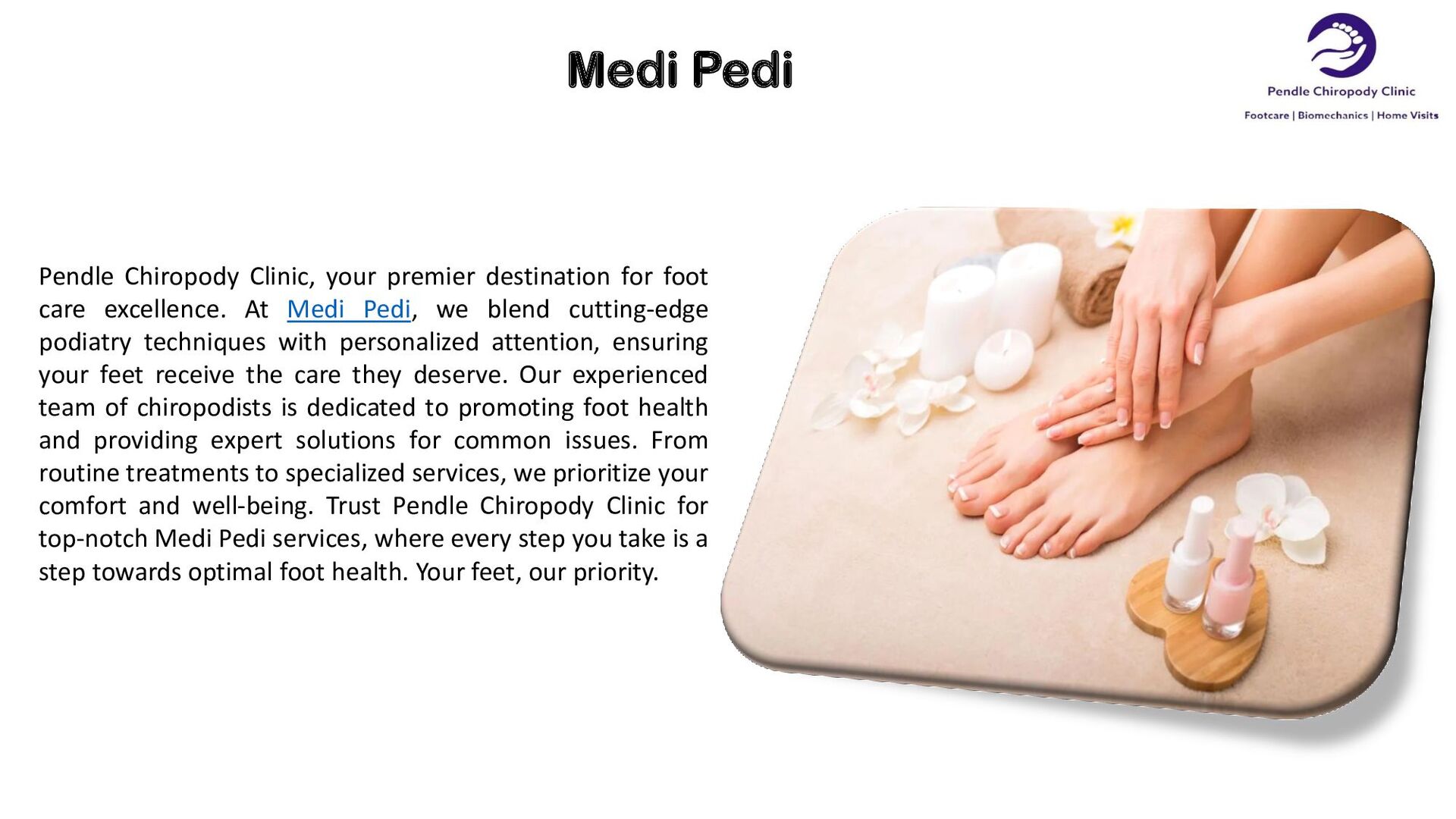 care excellence. At Medi Pedi, we blend cutting-edge podiatry techniques with personalized attention, ensuring your feet receive the care they deserve. Our experienced team of chiropodists is dedicated to promoting foot health and providing expert solutions for common issues. From routine treatments to specialized services, we prioritize your comfort and well-being. Trust Pendle Chiropody Clinic for top-notch Medi Pedi services, where every step you take is a step towards optimal foot health. Your feet, our priority.