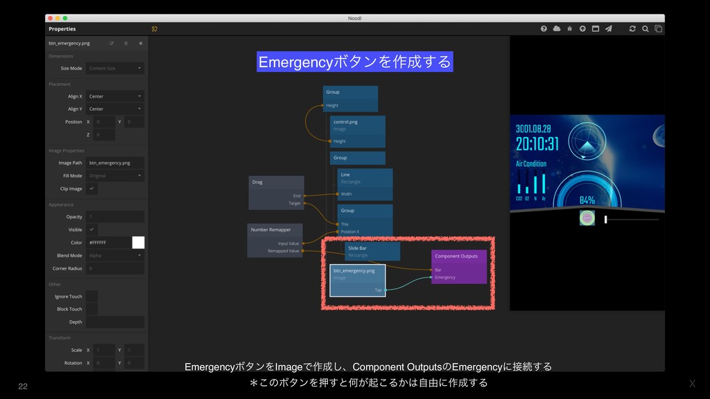 X EmergencyϘλϯΛImageͰ࡞͠ɺComponent OutputsͷEmergencyʹଓ͢Δ ˎ͜ͷϘλϯΛԡ͢ͱԿ͕ى͜Δ͔ࣗ༝ʹ࡞͢Δ 22 EmergencyϘλϯΛ࡞͢Δ