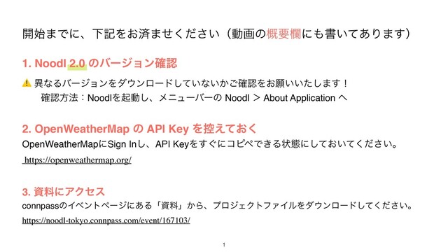KeyΛ͙͢ʹίϐϖͰ͖Δঢ়ଶʹ͓͍͍ͯͯͩ͘͠͞ɻ https://openweathermap.org/ 1. Noodl 2.0 ͷόʔδϣϯ֬ೝ ⚠ ҟͳΔόʔδϣϯΛμϯϩʔυ͍ͯ͠ͳ͍͔֬͝ೝΛ͓ئ͍͍ͨ͠·͢ʂ ɹɹ֬ೝํ๏ɿNoodlΛىಈ͠ɺϝχϡʔόʔͷ Noodl ʼ About Application 3. ࢿྉʹΞΫηε connpassͷΠϕϯτϖʔδʹ͋Δʮࢿྉʯ͔ΒɺϓϩδΣΫτϑΝΠϧΛμϯϩʔυ͍ͯͩ͘͠͞ɻ https://noodl-tokyo.connpass.com/event/167103/