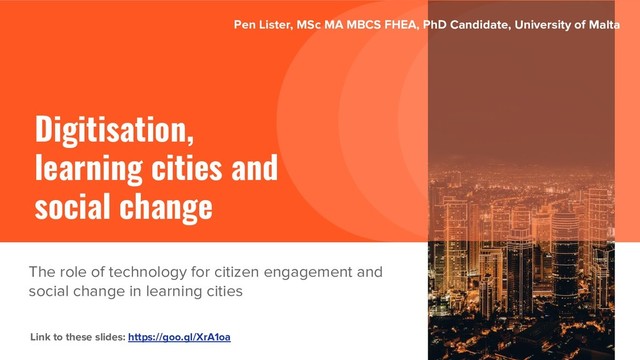 https://ec.europa.eu/epale/en • Anderson, L.W., & Krathwohl, D.R. (Eds.) (2001). A taxonomy for learning, teaching, and assessing: A revision of Bloom’s taxonomy of educational objectives. New York: Addison Wesley Longman. • EU DIGITAL SINGLE MARKET ICT SKILLS https://ec.europa.eu/digital-single-market/en/news/ict-work-digital-skills-workplace • Guidelines for Building Learning Cities, UNESCO Global Network of Learning Cities https://uil.unesco.org/fileadmin/keydocuments/LifelongLearning/learning-cities/en-guidelines-for-building-learning-cities.pdf • Huang R., Zhuang R., Yang J. (2017). Promoting Citizen’s Learning Experience in Smart Cities. In: Cheung S., Kwok L., Ma W., Lee LK., Yang H. (eds) Blended Learning. New Challenges and Innovative Practices. ICBL 2017. Lecture Notes in Computer Science, vol 10309. Springer, Cham • RSA. (2015). The Power to Create, The new digital learning age: how we can enable social mobility through technology. https://www.thersa.org/discover/publications-and-articles/reports/the-new-digital-learning-age • Skills for a connected world: report of the UNESCO Mobile Learning Week 2018, 26-30 March https://unesdoc.unesco.org/ark:/48223/pf0000265893 • Speller, L. (2018). Using Bloom’s Taxonomy to Write Effective Learning Objectives, Teaching Innovation and Pedagogical Support, University of Arkansas. https://tips.uark.edu/using-blooms-taxonomy/ • State of world population 2007 Unleashing the Potential of Urban Growth. https://www.unfpa.org/sites/default/files/pub-pdf/695_filename_sowp2007_eng.pdf • The Digital Competence Framework, DigComp 2.0 (2016) & DigComp 2.1 (2018). https://ec.europa.eu/jrc/en/digcomp/digital-competence-framework • The Digital Competence Framework for Educators (2017). https://ec.europa.eu/jrc/en/publication/eur-scientific-and-technical-research-reports/european-framework-digital-competence-educators-digcompedu • UNESCO Designing Inclusive Digital Solutions and Developing Digital Skills https://ec.europa.eu/epale/en/blog/unescos-guidelines-designing-inclusive-digital-solutions-and-developing-digital-skills • UN sustainable goals https://www.un.org/sustainabledevelopment/sustainable-development-goals/ • Wildemeersch, D., & Jütte, W. (2017). Editorial: digital the new normal - multiple challenges for the education and learning of adults. In European journal for Research on the Education and Learning of Adults 8 (2017) 1, S. 7-20 - URN: urn:nbn:de:0111-pedocs-130189 • Winden, W. van, Carvalho, L. de (2017). Cities and digitalization. Amsterdam: Amsterdam University of Applied Sciences. • World Urbanization Prospects: The 2018 Revision https://population.un.org/wup/Publications/ Pen Lister, MSc MA MBCS FHEA, PhD Candidate, University of Malta Sources Digitisation, learning cities and social change