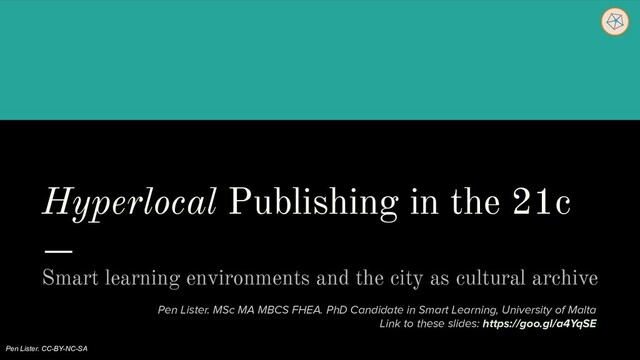 Smart learning environments and the city as cultural archive. This example of smart learning concerns creative writing in urban spaces, and literature for historical or heritage ideas and purposes. Here we investigate how smart learning concepts can be used to encourage urban citizens to become more aware of their surroundings, and even to contribute creative vision and ideas to build real world spaces of imagination, inspiration and learning.