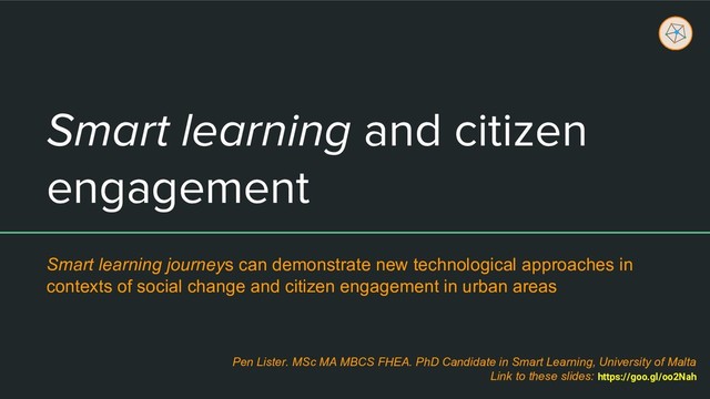 Fechner, T., Schlarmann, D., & Kray, C. (2016). Facilitating citizen engagement in situ: assessing the impact of pro-active geofenced notifications, 2016. Proceedings MobileHCI '16 Proceedings of the 18th International Conference on Human-Computer Interaction with Mobile Devices and Services, pp. 353-364. ACM Library. Available at https://dl.acm.org/citation.cfm?id=2935379 • Freigang, S., Schlenker, L., & Köhler, T. (2018). A conceptual framework for designing smart learning environments. Smart Learning Environments 2018 5:27. https://doi.org/10.1186/s40561-018-0076-8 • Koc-Michalska, K., Lilleker, D., G., Vedel, T. (2016). Civic political engagement and social change in the new digital age. Editorial. New Media & Society 2016, Vol. 18(9) 1807–1816. DOI https://doi.org/10.1177/1461444815616218 • Lee, E., K. (2017). Engaging Citizens in Society. Stanford Social Innovation Review (2017). Available at https://ssir.org/articles/entry/engaging_citizens_in_society# • Long, P., Mai, T., T., & Massey, B. (2016). Key Factors for Effective Citizens Engagement in Smart City: The Case of Cork City. Cork Citi Engage Project. Available at http://iot-smartcities.lero.ie/wp-content/uploads/2016/12/CorkCitiEngage-Identifying-key-factors-for-effective-citizens-engagement-in-Smart-City-initiatives.pdf • Shetty, S. (2018). Gartner Says Citizen Engagement Is Critical to the Success of Smart Cities. Analysts Share Insights Into the Development of Smart Cities at Gartner Symposium/ITxpo, March 5-7 2018, in Dubai. Blogpost. Available at https://www.gartner.com/en/newsroom/press-releases/2018-03-07-gartner-says-citizen-engagement-is-critical-to-the-success-of-smart-cities • Van Ransbeeck, D. (2016). Key learnings (sic) of citizen engagement and smart cities. Blogpost. CitizenLab. Available at https://www.citizenlab.co/blog/civic-engagement/3-key-learnings-to-move-forward-with-citizen-engagement-co-creation/ Pen Lister. MSc MA MBCS FHEA. PhD Candidate