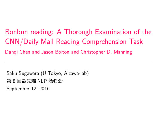 ൛Ͱ LSTM ͕ͩͬͨվగ൛ (v2) Ͱ RNN+GRU ʹมߋ 1. hR i = RNN(hR i−1 , w(pi)), hL i = RNN(hL i+1 , w(pi)) 2. pi = concat(hR i , hL i ) 2. Attention 1. αi = softmaxi q⊤Wspi 2. o = ∑ i αipi α: prob. distribution (=attention), q: question embedding, pi: contextual embedding for pi (i-th word in the passage), Ws: weight matrix used for a bilinear term (it frexibly computes a similarity between q and pi), o: output vector 3. Prediction a = argmaxa∈p W⊤ a o 18 / 26