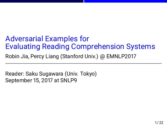 systems truly understand lanugage remains unclear. Proposed Method An adversarial evaluation scheme for the RC dataset: testing whether systems can answer questions about paragraphs that contain adversarially inserted sentences. Result The accuracy of sixteen published models drops from an average of 75% F1 score to 36%. → Experiments demonstrate that no published open-source model is robust to the addition of adversarial sentences. 22 / 22