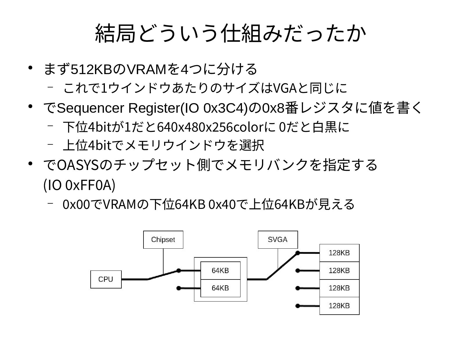 画像先読みでお茶を濁す – 1スライドが5秒未満になることはそんなに無いだろう – ほぼすべてのコンベンショナルメモリを食いつぶすという問題 • EMM.SYSを使えば一応拡張メモリを使えるが・・・ – やっぱり食いつぶしたのでEMMを使う • EMM(Expanded Memory Manager)ってなぁに? – 本来DOS(リアルモード)は1MBのメモリ領域のみにアクセス可能 – 1MBの外のメモリを1MBの内側の領域に割り当てる • あら不思議 メモリがいっぱい使える(+7MBくらい) • あとはスライドショーっぽい感じの操作を実装するだけ