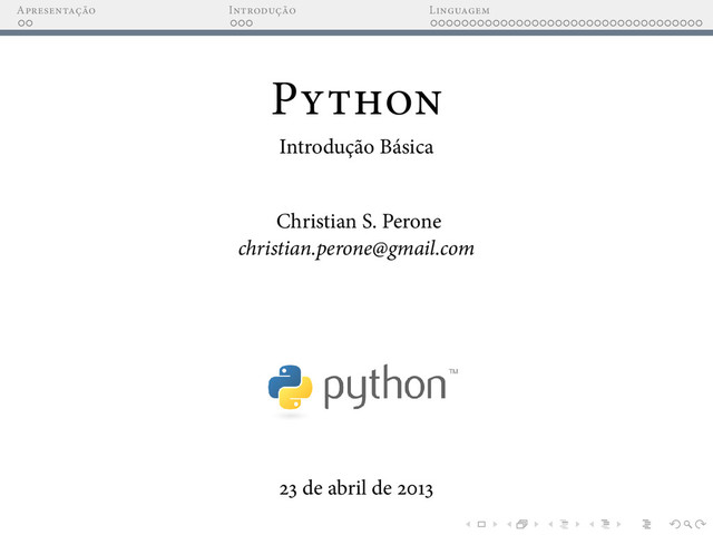 linguagem: Versão .x Lançada em de Out . Atualmente o branch da versão .x é o que tem mais módulos externos disponíveis e também é a mais utilizada pela comunidade. Esta introdução ao Python aborda esta versão da linguagem, mais especi camente a versão . .