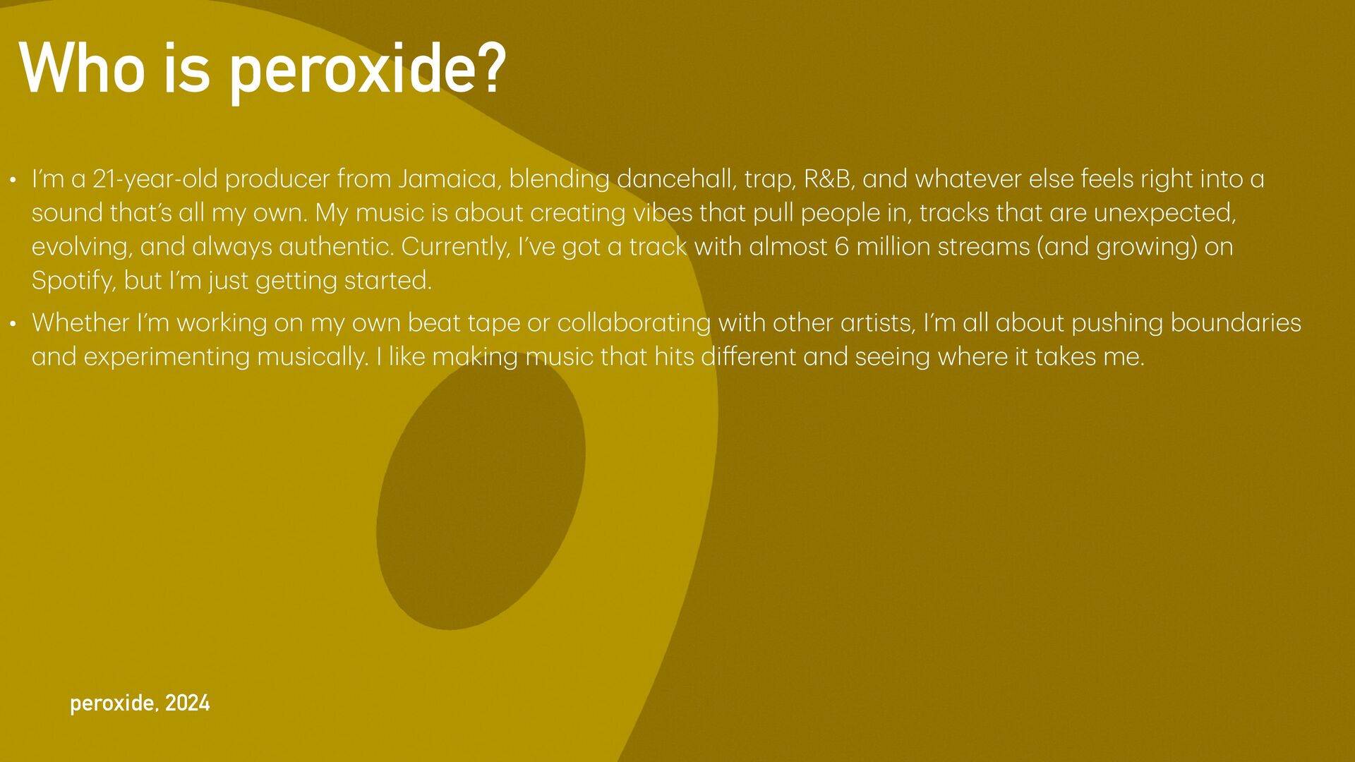 r-old producer from J a m a ic a , blending d a nceh a ll, tr a p, R&B, a nd wh a tever else feels right into a sound th a t’s a ll my own. My music is a bout cre a ting vibes th a t pull people in, tr a cks th a t a re unexpected, evolving, a nd a lw a ys a uthentic. Currently, I’ve got a tr a ck with a lmost 6 million stre a ms ( a nd growing) on Spotify, but I’m just getting st a rted. • Whether I’m working on my own be a t t a pe or coll a bor a ting with other a rtists, I’m a ll a bout pushing bound a ries a nd experimenting music a lly. I like m a king music th a t hits di ff erent a nd seeing where it t a kes me.