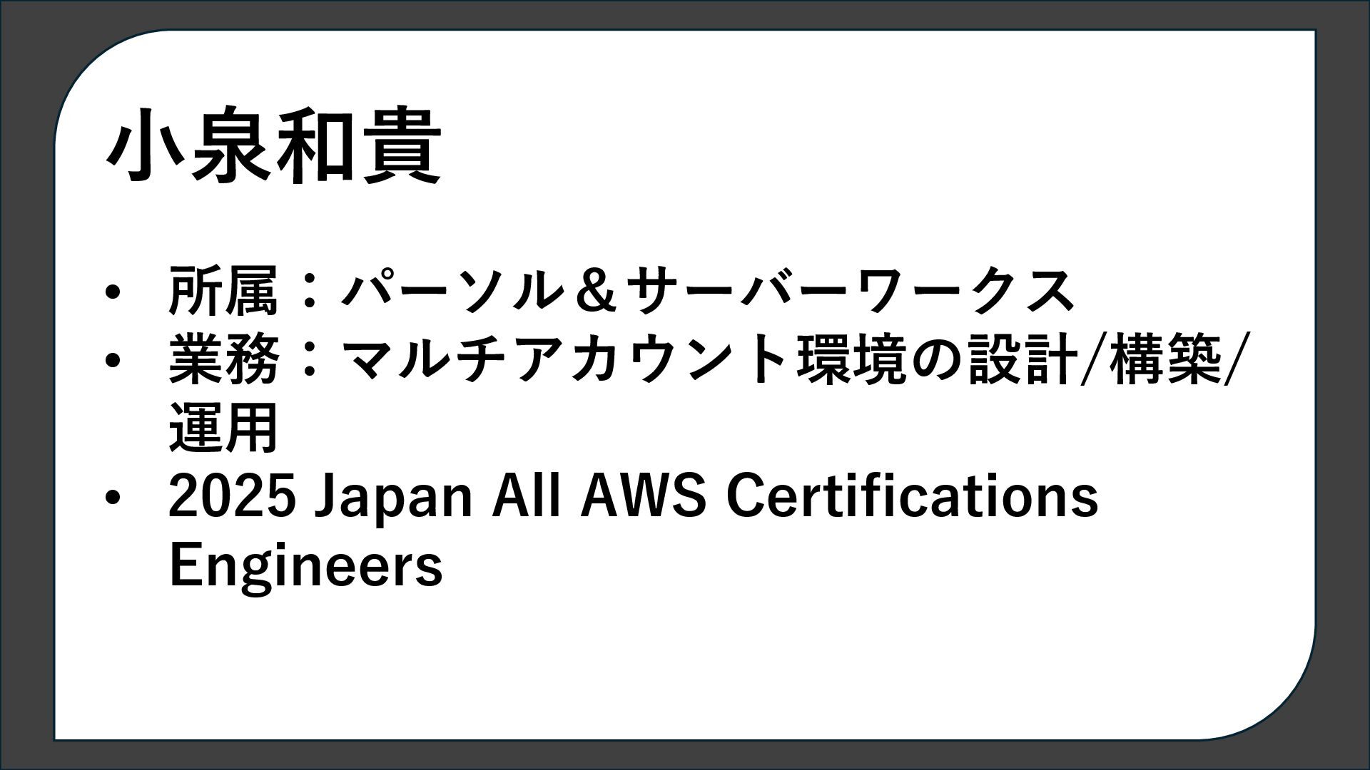 小泉和貴 • 所属:パーソル&サーバーワークス • 業務:マルチアカウント環境の設計/構築/ 運用 • 2025 Japan All