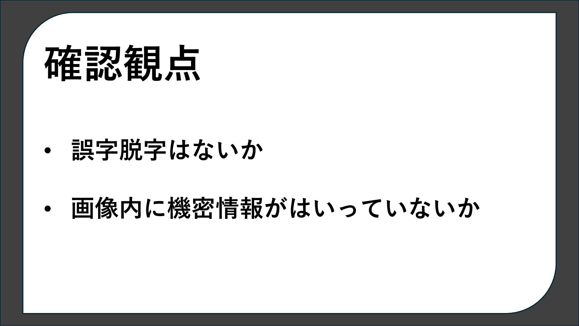 • 誤字脱字はないか • 画像内に機密情報がはいっていないか 確認観点