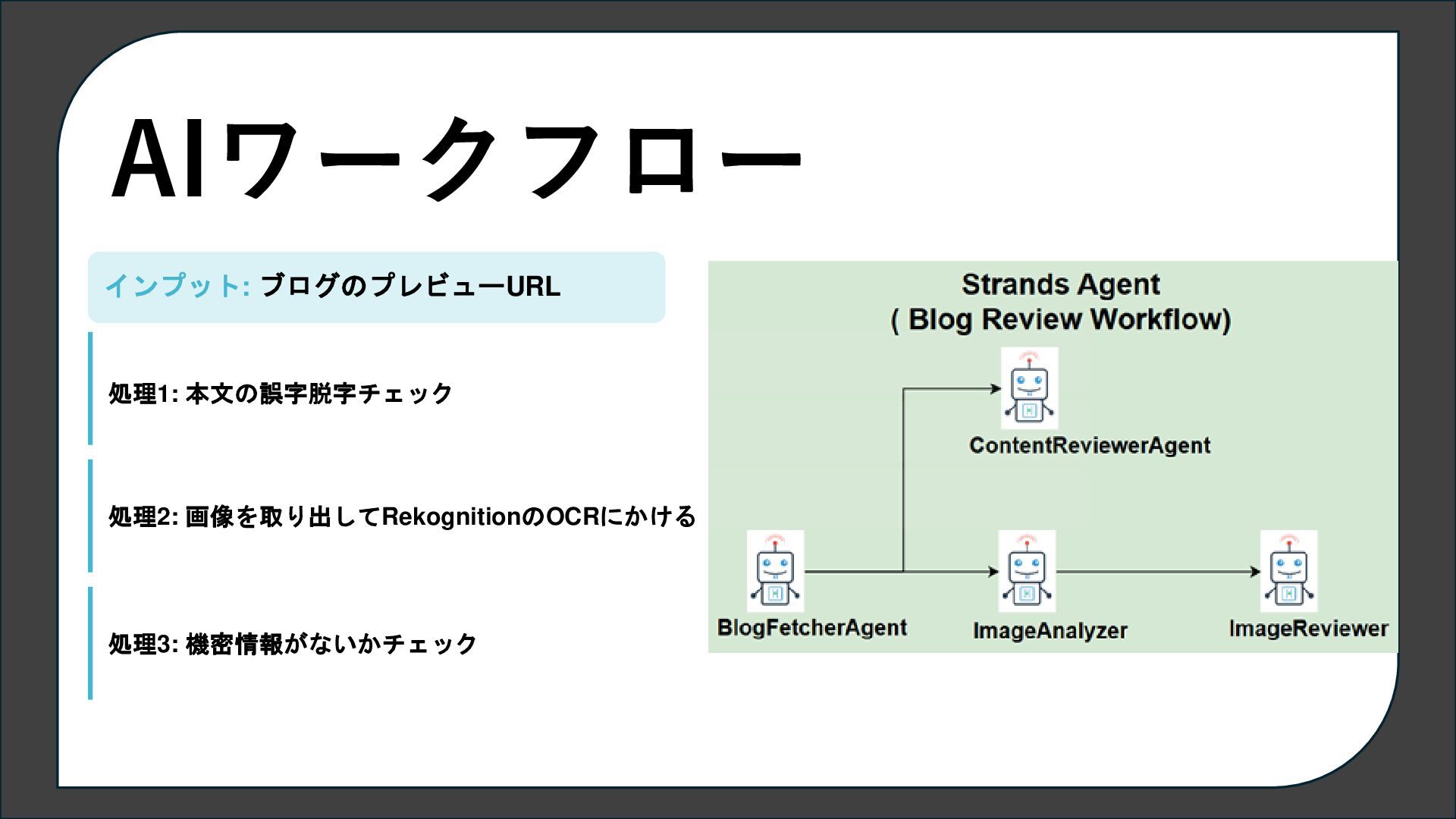 AIワークフロー インプット: ブログのプレビューURL 処理1: 本文の誤字脱字チェック 処理2: 画像を取り出してRekognitionのOCRにかける 処理3: 機密情報がないかチェック