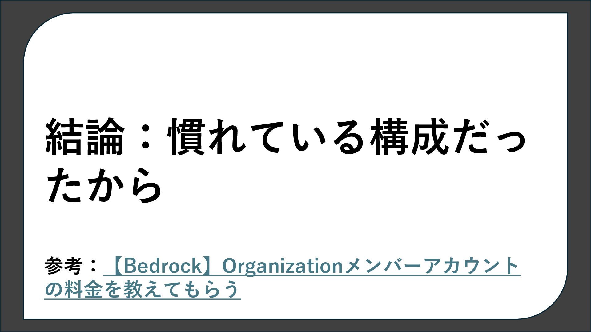 結論:慣れている構成だっ たから 参考:【Bedrock】Organizationメンバーアカウント の料金を教えてもらう