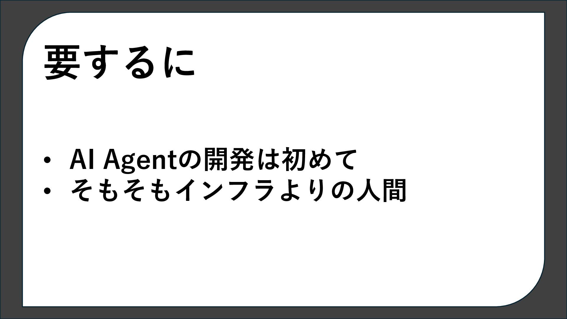 要するに • AI Agentの開発は初めて • そもそもインフラよりの人間