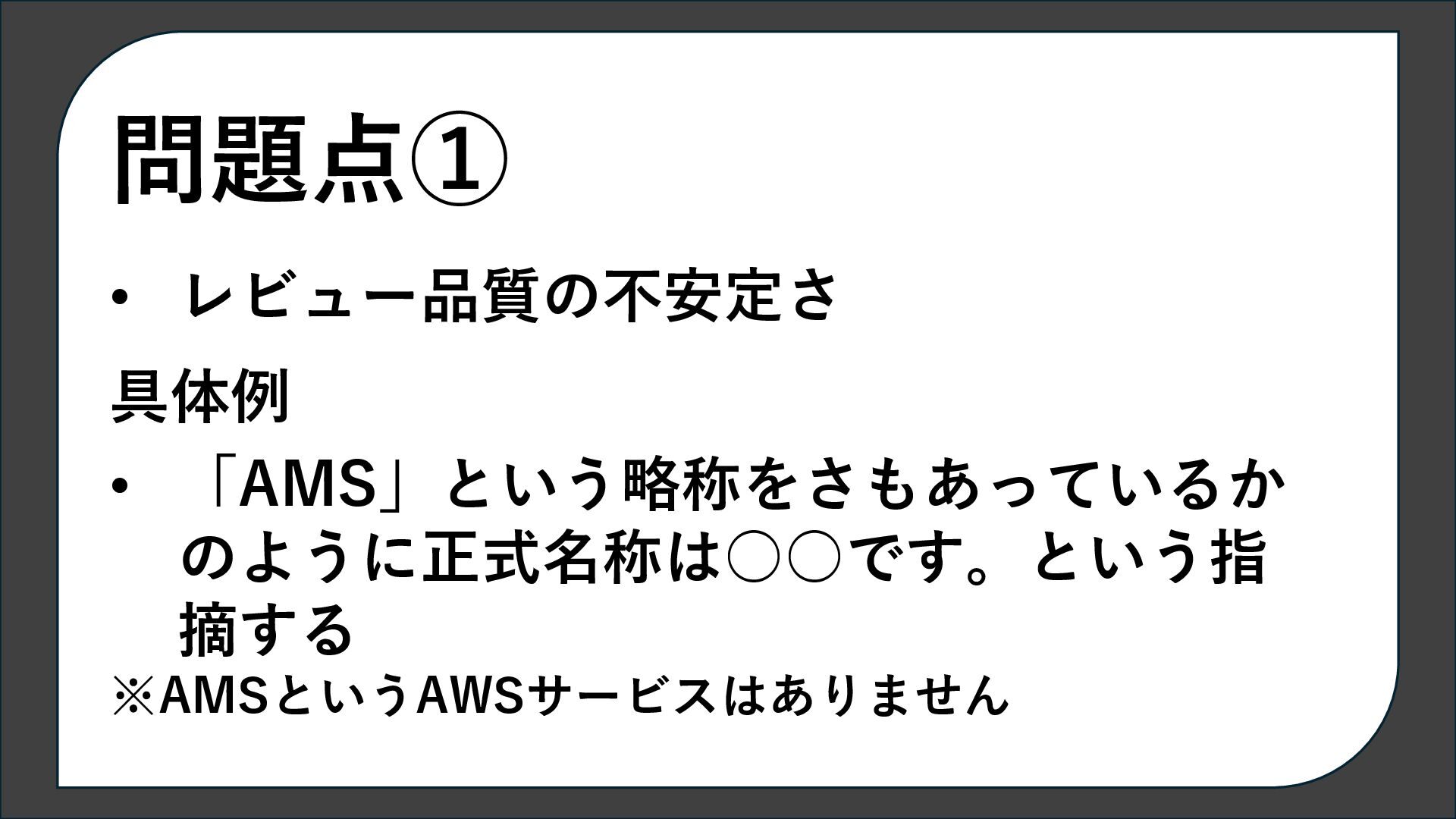 • レビュー品質の不安定さ 具体例 問題点① • 「AMS」という略称をさもあっているか のように正式名称は◦◦です。という指 摘する ※AMSというAWSサービスはありません