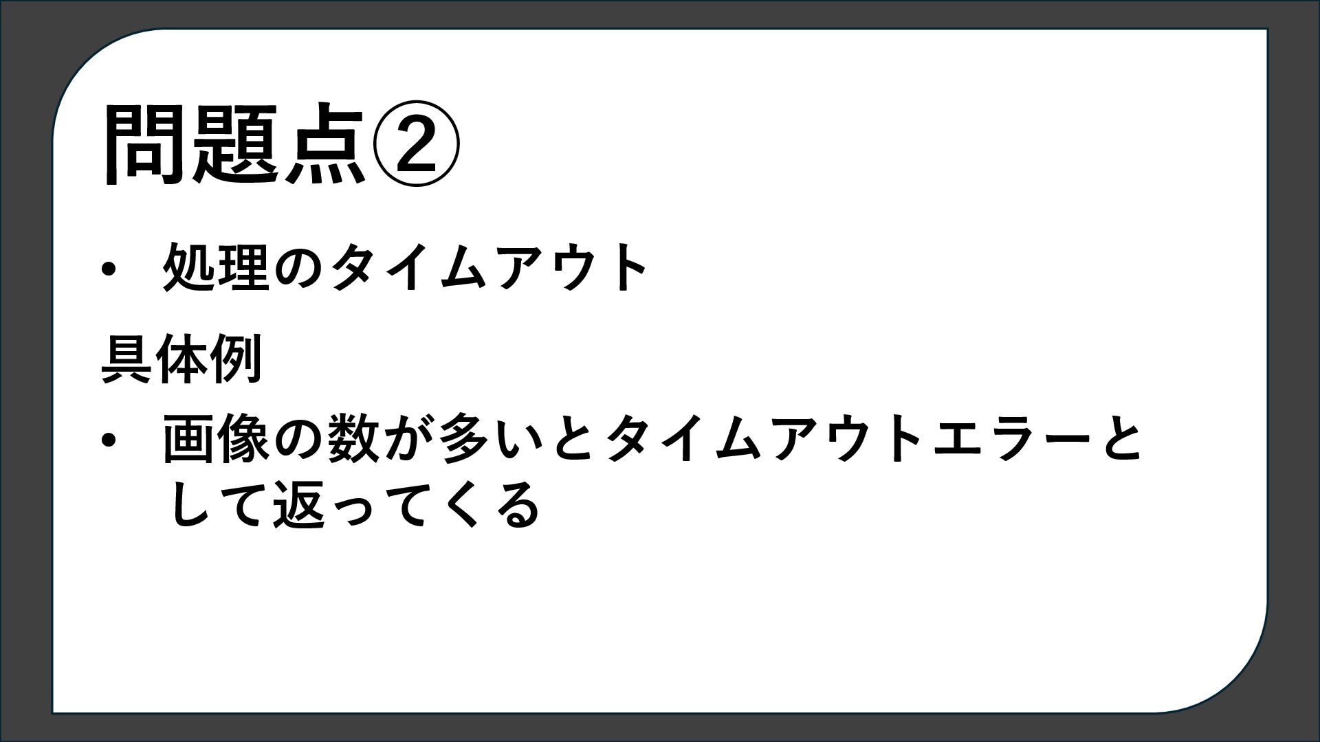 • 処理のタイムアウト 具体例 問題点② • 画像の数が多いとタイムアウトエラーと して返ってくる