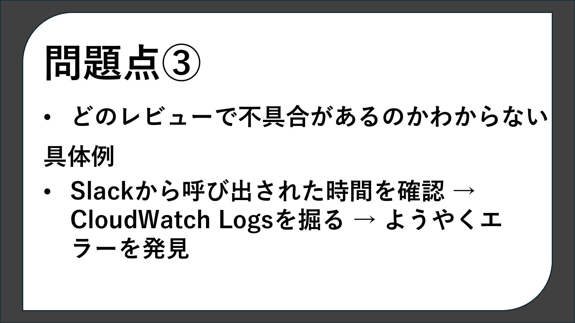 • どのレビューで不具合があるのかわからない 具体例 問題点③ • Slackから呼び出された時間を確認 → CloudWatch Logsを掘る →