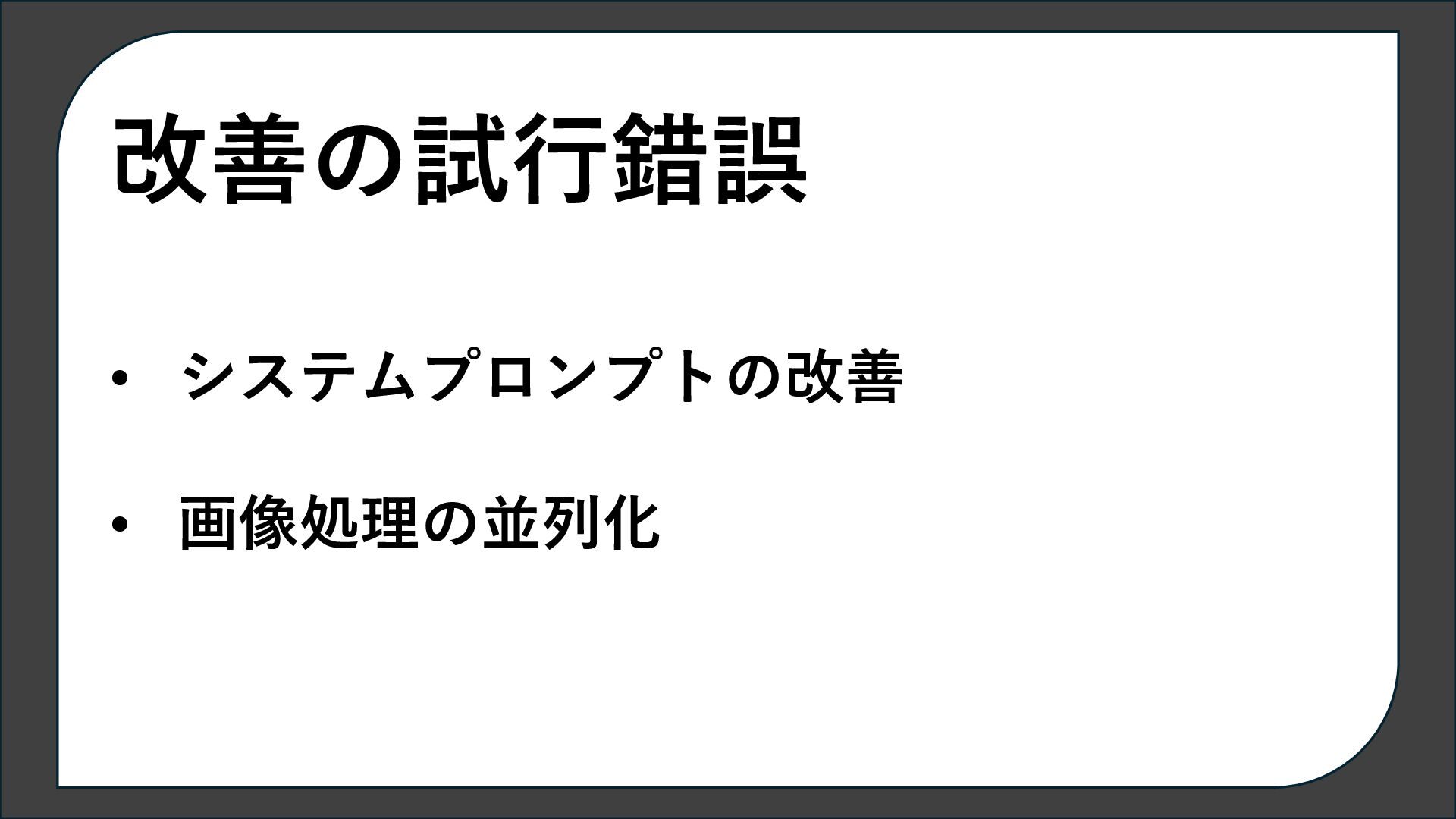 • システムプロンプトの改善 • 画像処理の並列化 改善の試行錯誤