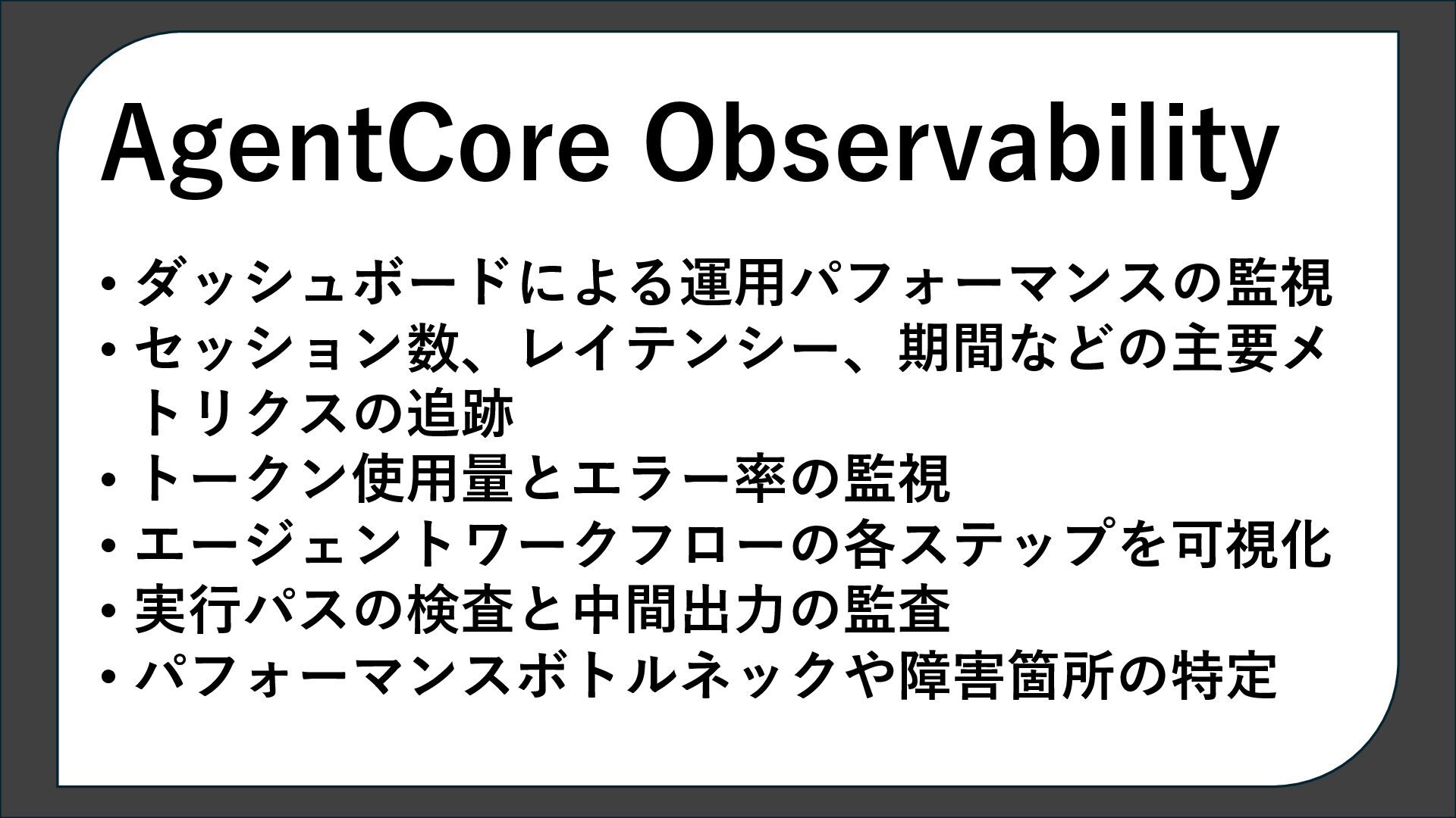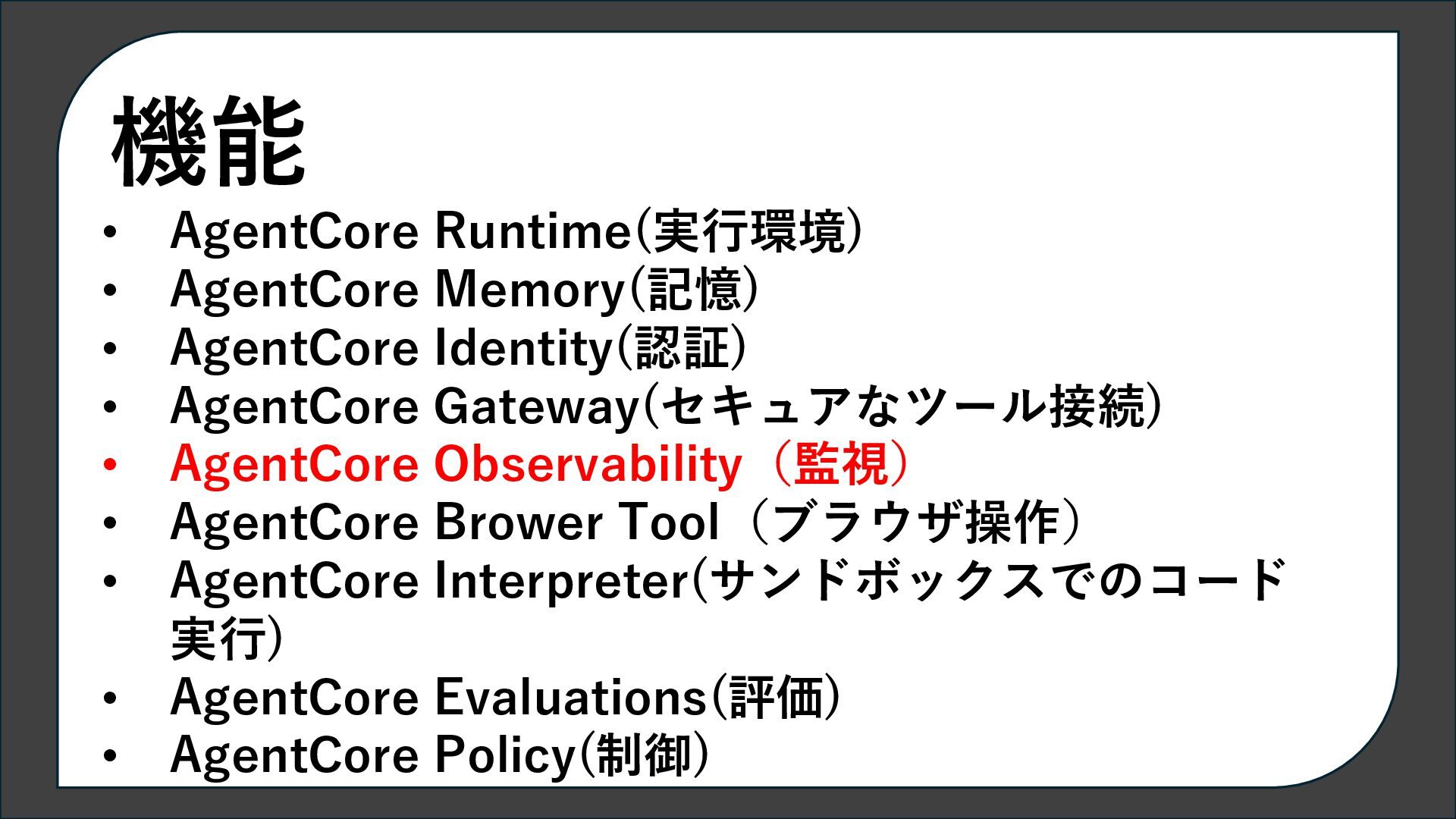• AgentCore Gateway(セキュアなツール接続) • AgentCore Observability(監視) • AgentCore Brower Tool(ブラウザ操作) • AgentCore Interpreter(サンドボックスでのコード 実行) • AgentCore Evaluations(評価) • AgentCore Policy(制御)