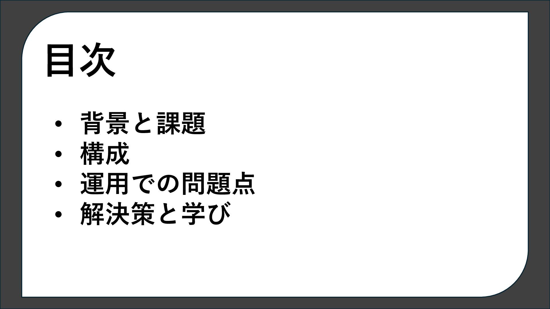目次 • 背景と課題 • 構成 • 運用での問題点 • 解決策と学び