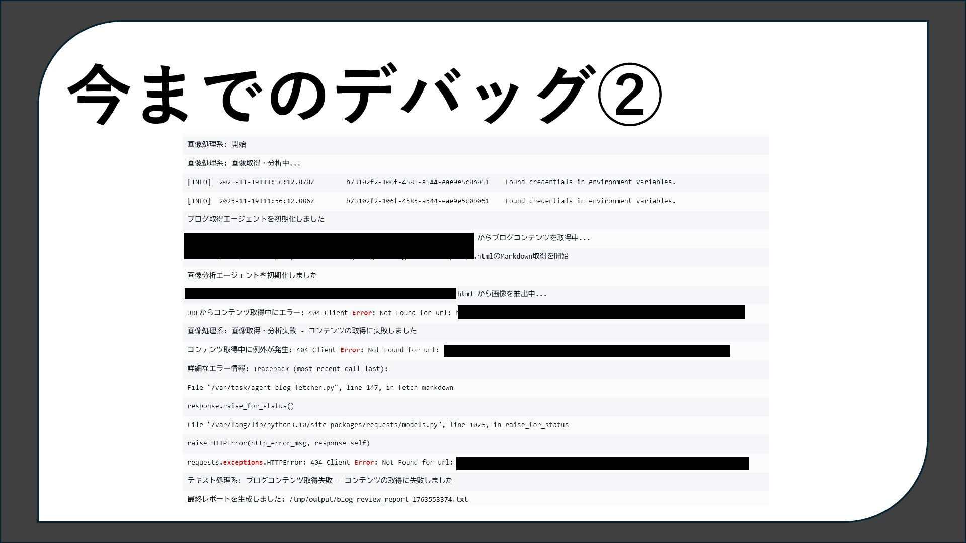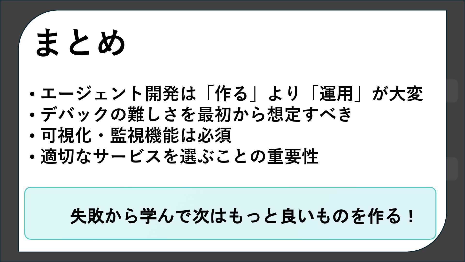 まとめ 失敗から学んで次はもっと良いものを作る! • エージェント開発は「作る」より「運用」が大変 • デバックの難しさを最初から想定すべき • 可視化・監視機能は必須 • 適切なサービスを選ぶことの重要性