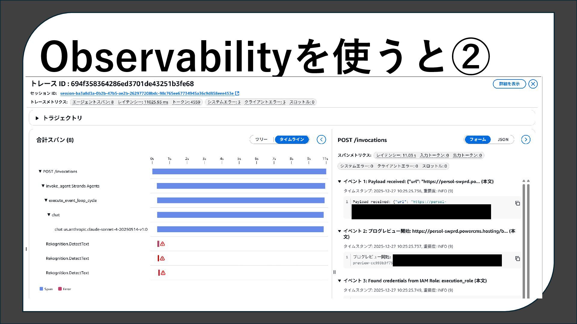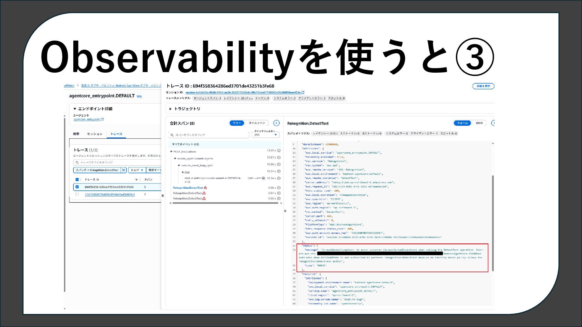 実行パスの検査と中間出力の監査 • パフォーマンスボトルネックや障害箇所の特定 AgentCore Observability