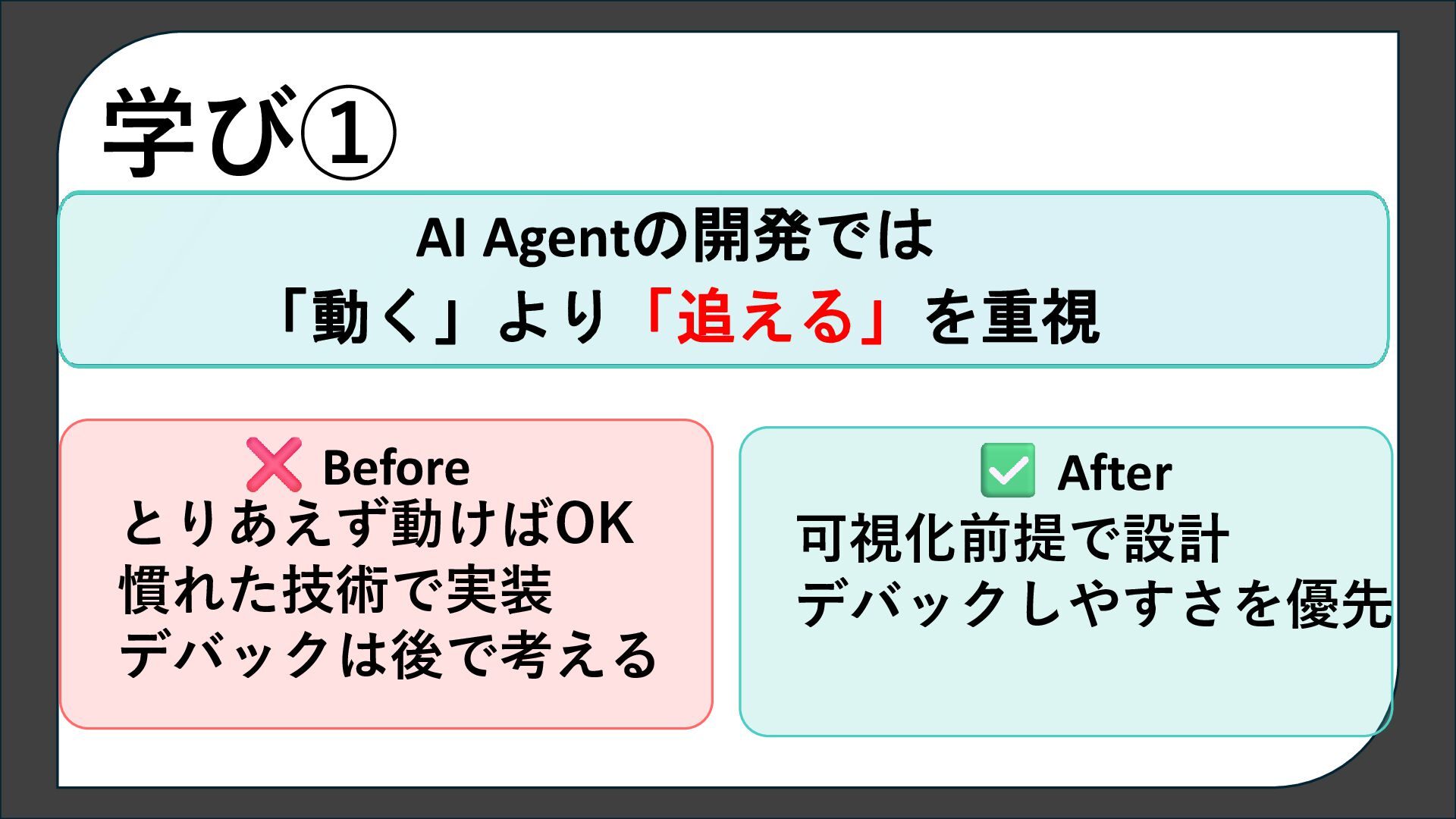 学び① AI Agentの開発では 「動く」より「追える」を重視 Before After とりあえず動けばOK 慣れた技術で実装 デバックは後で考える 可視化前提で設計