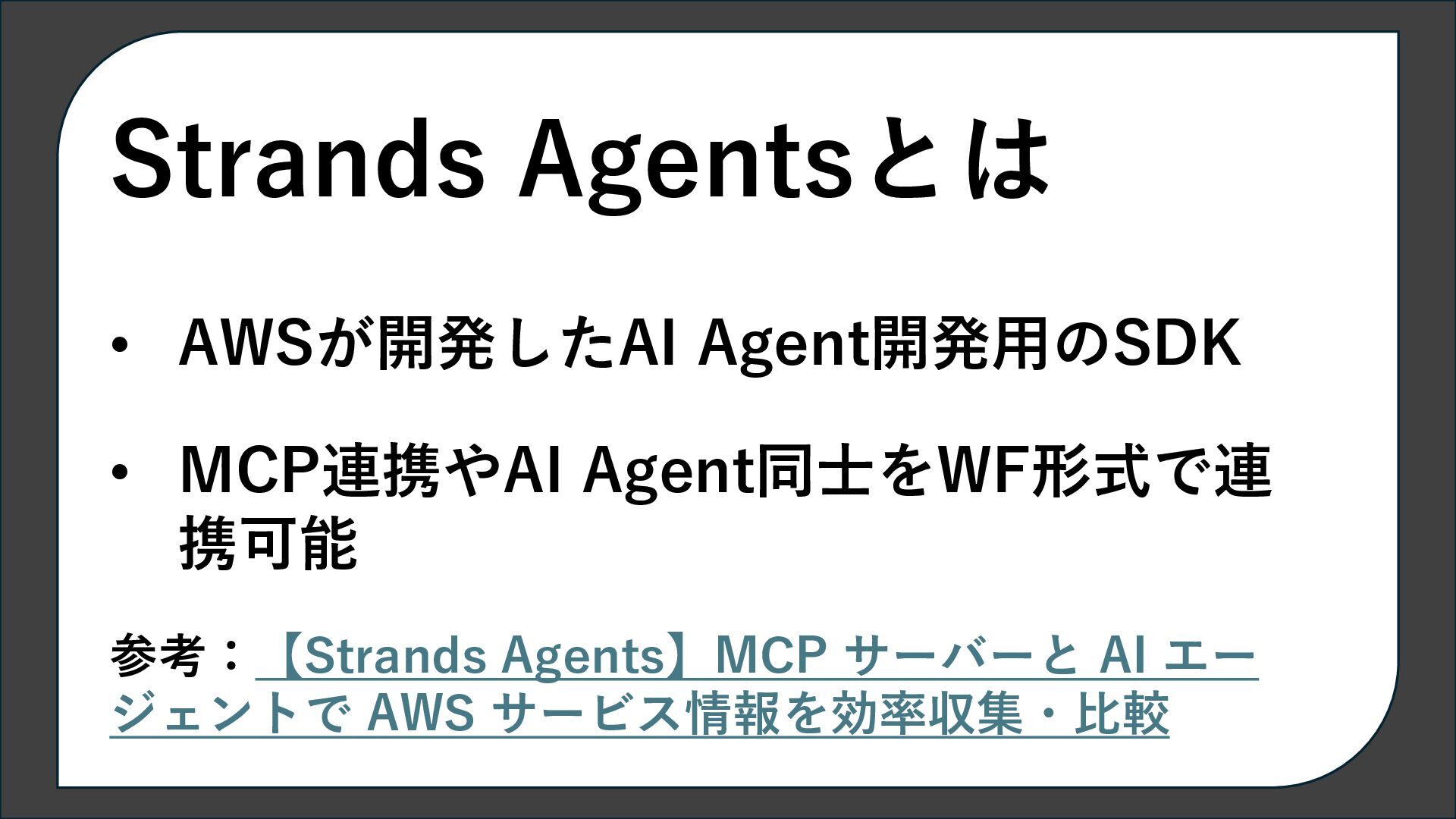 Strands Agentsとは • AWSが開発したAI Agent開発用のSDK 参考:【Strands Agents】MCP サーバーと AI エー