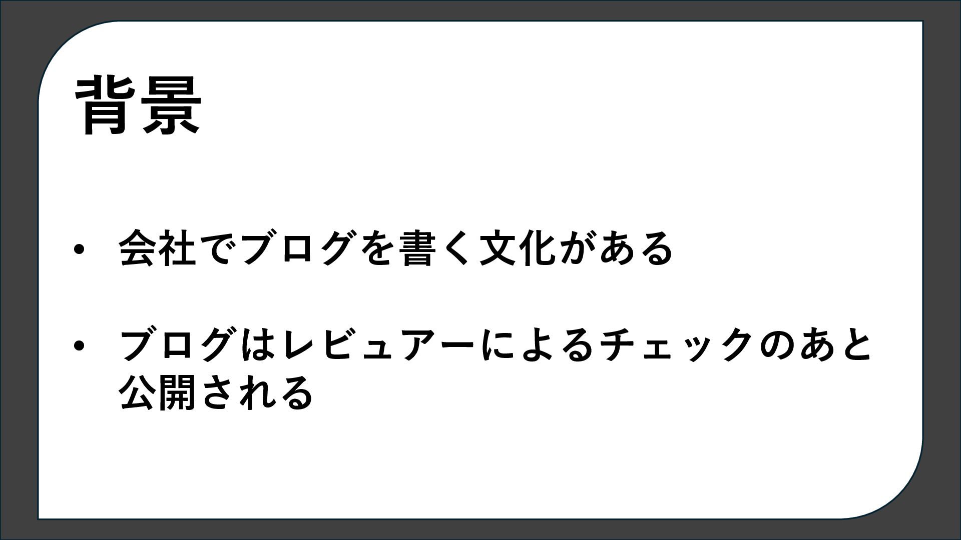 背景 • 会社でブログを書く文化がある • ブログはレビュアーによるチェックのあと 公開される