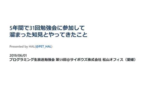 5年間で31回勉強会に参加して 溜まった知⾒とやってきたこと Presented by HAL(@PET_HAL) 2019/06/01 プログラミング⽣放送勉強会 第59回@サイボウズ株式会社 松⼭オフィス(愛媛)
