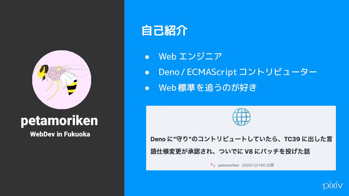 2 自己紹介 • Web エンジニア • Deno / ECMAScript コントリビューター • Web 標準 を追うのが好き petamoriken WebDev