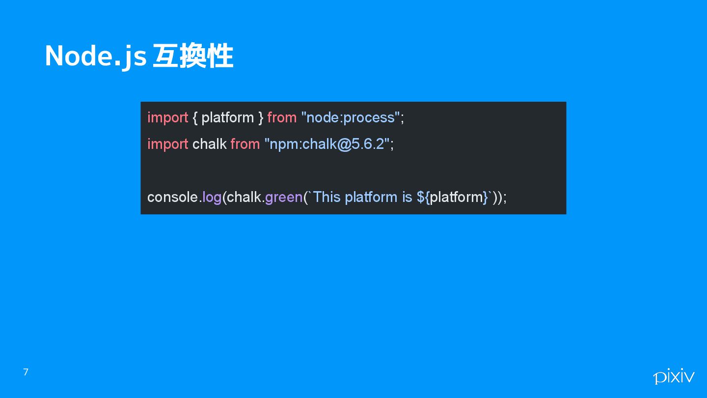 7 Node.js 互換性 import { platform } from "node:process"; import chalk