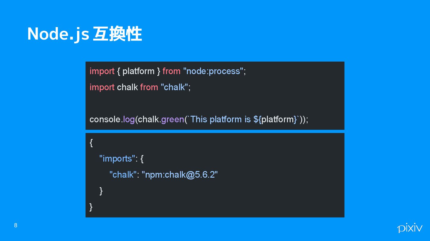 8 Node.js 互換性 import { platform } from "node:process"; import chalk